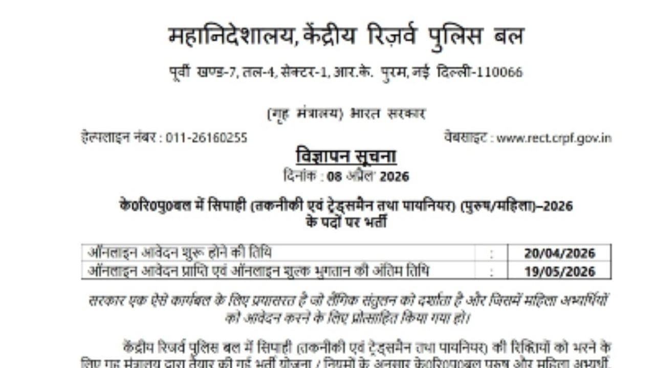CRPF Constable Bharti 2026 Notification: ਕੇਂਦਰੀ ਰਿਜ਼ਰਵ ਪੁਲਿਸ ਫੋਰਸ (CRPF) ਕਾਂਸਟੇਬਲ ਭਰਤੀ ਦੀ ਉਡੀਕ ਕਰ ਰਹੇ ਉਮੀਦਵਾਰਾਂ ਲਈ ਇੱਕ ਵੱਡਾ ਅਪਡੇਟ ਹੈ। CRPF ਕਾਂਸਟੇਬਲ ਭਰਤੀ 2026 ਲਈ ਨੋਟੀਫਿਕੇਸ਼ਨ ਜਾਰੀ ਕਰ ਦਿੱਤਾ ਗਿਆ ਹੈ। CRPF ਨੇ ਕਾਂਸਟੇਬਲ (ਤਕਨੀਕੀ, ਟ੍ਰੇਡਸਮੈਨ ਅਤੇ ਪਾਇਨੀਅਰ) ਭਰਤੀ ਵਿੱਚ ਕੁੱਲ 9175 ਅਸਾਮੀਆਂ ਲਈ ਅਰਜ਼ੀਆਂ ਮੰਗੀਆਂ ਹਨ। ਅਰਜ਼ੀ ਪ੍ਰਕਿਰਿਆ 20 ਅਪ੍ਰੈਲ ਤੋਂ ਸ਼ੁਰੂ ਹੋਵੇਗੀ। ਦਿਲਚਸਪੀ ਰੱਖਣ ਵਾਲੇ ਅਤੇ ਯੋਗ ਉਮੀਦਵਾਰ 19 ਮਈ, 2026 ਤੱਕ ਔਨਲਾਈਨ ਅਰਜ਼ੀ ਦੇ ਸਕਦੇ ਹਨ ਅਤੇ ਫੀਸ ਜਮ੍ਹਾਂ ਕਰ ਸਕਦੇ ਹਨ। ਜ਼ਿਕਰਯੋਗ ਹੈ ਕਿ, ਅਸਾਮੀਆਂ ਔਰਤਾਂ ਅਤੇ ਪੁਲਿਸ ਉਮੀਦਵਾਰਾਂ ਲਈ ਰਾਖਵੀਆਂ ਹਨ। CRPF ਨੇ ਨੋਟੀਫਿਕੇਸ਼ਨ ਵਿੱਚ ਸਪੱਸ਼ਟ ਕੀਤਾ ਹੈ ਕਿ ਸਰਕਾਰ ਇੱਕ ਅਜਿਹੇ ਕਾਰਜਬਲ ਲਈ ਯਤਨਸ਼ੀਲ ਹੈ ਜੋ ਲੈਂਗਿਕ ਸੰਤੁਲਨ ਨੂੰ ਦਰਸਾਉਂਦਾ ਹੋਵੇ ਅਤੇ ਮਹਿਲਾ ਉਮੀਦਵਾਰਾਂ ਨੂੰ ਅਰਜ਼ੀ ਦੇਣ ਲਈ ਉਤਸ਼ਾਹਿਤ ਕਰਦਾ ਹੋਵੇ।