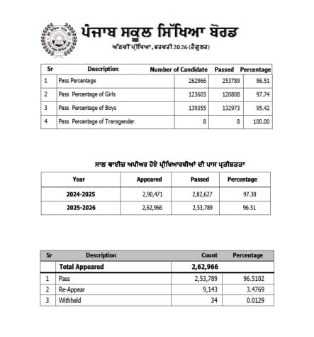 ਪੰਜਾਬ ਸਕੂਲ ਸਿੱਖਿਆ ਬੋਰਡ ਨੇ 8ਵੀਂ ਦਾ ਨਤੀਜਾ ਐਲਾਨ ਦਿੱਤਾ ਹੈ। ਹਰ ਸਾਲ ਵਾਂਗ ਇਸ ਵਾਰ ਵੀ ਪਹਿਲੇਂ ਤਿੰਨੋਂ ਸਥਾਨਾਂ ਤੇ ਕੁੜੀਆਂ ਦਾ ਕਬਜਾ ਰਿਹਾ ਹੈ।ਪੰਜਾਬ ਸਕੂਲ ਸਿੱਖਿਆ ਬੋਰਡ ਵੱਲੋਂ ਚੇਅਰਮੈਨ, ਡਾ. ਅਮਰਪਾਲ ਸਿੰਘ, ਜੀ ਦੀ ਯੋਗ ਅਗਵਾਈ ਹੇਠ ਮਿਤੀ 10.04.2026 ਨੂੰ ਅਕਾਦਮਿਕ ਸਾਲ 2025-2026 ਅੱਠਵੀਂ ਸ਼੍ਰੇਣੀ ਦਾ ਨਤੀਜਾ ਘੋਸ਼ਿਤ ਕੀਤਾ ਗਿਆ। ਇਸ ਸਾਲ ਅੱਠਵੀਂ ਸ਼੍ਰੇਣੀ ਦੀ ਪ੍ਰੀਖਿਆ ਵਿੱਚ ਕੁੱਲ 10422 ਸਕੂਲਾਂ ਦੇ 262966 (ਦੋ ਲੱਖ ਬਾਹਠ ਹਜਾਰ ਨੌ ਸੌ ਛਿਆਹਠ ) ਪ੍ਰੀਖਿਆਰਥੀ ਪ੍ਰੀਖਿਆ ਵਿੱਚ ਅਪੀਅਰ ਹੋਏ, ਜਿਨ੍ਹਾਂ ਵਿੱਚੋਂ 253789 (ਦੋ ਲੱਖ ਤਰਵੰਜਾ ਹਜਾਰ ਸੱਤ ਸੌ ਉਣਾਨਵੇ) ਪ੍ਰਮੋਟ ਹੋਏ ਅਤੇ ਇਸ ਨਤੀਜੇ ਦੀ ਪਾਸ ਪ੍ਰਤੀਸ਼ਤਤਾ 96.51 ਰਹੀ ਹੈ।
