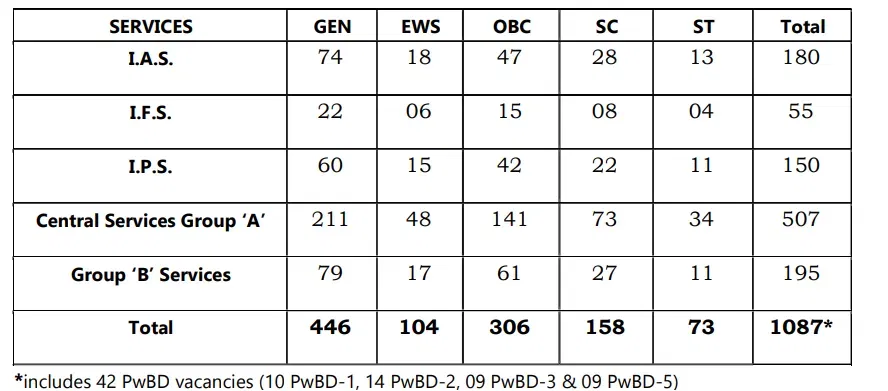 ਯੂਨੀਅਨ ਪਬਲਿਕ ਸਰਵਿਸ ਕਮਿਸ਼ਨ ਦੁਆਰਾ ਜਾਰੀ ਜਾਣਕਾਰੀ ਅਨੁਸਾਰ, 958 ਅਸਾਮੀਆਂ ਲਈ ਭਰਤੀ ਦਾ ਐਲਾਨ ਕੀਤਾ ਗਿਆ ਹੈ। ਯੋਗਤਾ ਪੂਰੀ ਕਰਨ ਵਾਲਿਆਂ ਵਿੱਚੋਂ, 180 ਭਾਰਤੀ ਪ੍ਰਸ਼ਾਸਨਿਕ ਸੇਵਾ (IAS), 55 ਭਾਰਤੀ ਵਿਦੇਸ਼ ਸੇਵਾ (IFS) ਵਿੱਚ ਸ਼ਾਮਲ ਹੋਣਗੇ, ਅਤੇ 150 ਭਾਰਤੀ ਪੁਲਿਸ ਸੇਵਾ (IPS) ਵਿੱਚ ਸ਼ਾਮਲ ਹੋਣਗੇ। 180 ਆਈਏਐਸ ਅਸਾਮੀਆਂ ਵਿੱਚੋਂ, 74 ਗੈਰ-ਰਾਖਵੇਂ ਵਰਗ ਲਈ ਰਾਖਵੇਂ ਹਨ, ਜਦੋਂ ਕਿ 28 ਅਨੁਸੂਚਿਤ ਜਾਤੀਆਂ ਲਈ, 13 ਅਨੁਸੂਚਿਤ ਜਨਜਾਤੀਆਂ ਲਈ, 47 ਓਬੀਸੀ ਲਈ, ਅਤੇ 18 ਈਡਬਲਯੂਐਸ ਸ਼੍ਰੇਣੀ ਲਈ ਰਾਖਵੇਂ ਹਨ।