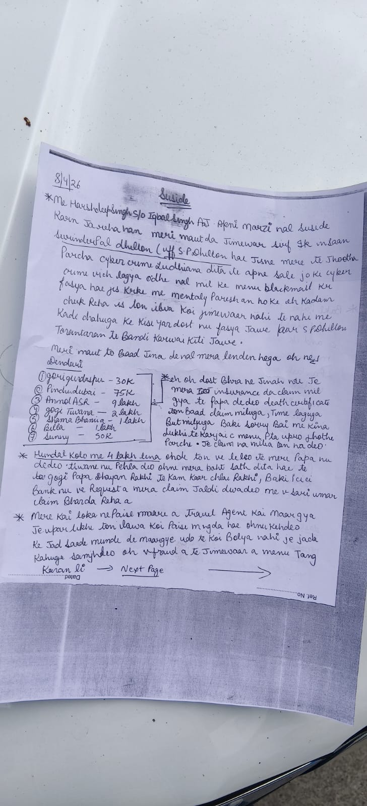 ਉਨ੍ਹਾਂ ਅੱਗੇ ਦੱਸਿਆ ਕਿ ਉਸਨੇ ਸਵੇਰੇ 10:30 ਵਜੇ ਦੇ ਕਰੀਬ ਮੇਰੇ ਨਾਲ ਚਾਹ ਪੀਤੀ। ਮੈਂ ਉਸਨੂੰ ਦੁਪਹਿਰ 1 ਵਜੇ ਦੇ ਕਰੀਬ ਦੁਪਹਿਰ ਦਾ ਖਾਣਾ ਖਾਣ ਲਈ ਕਿਹਾ। ਉਸਦੇ ਕਮਰੇ ਦਾ ਦਰਵਾਜ਼ਾ ਬੰਦ ਸੀ। ਜਦੋਂ ਮੈਂ ਅੰਦਰ ਦੇਖਿਆ ਤਾਂ ਉਹ ਪੱਖੇ ਨਾਲ ਲਟਕਿਆ ਹੋਇਆ ਸੀ। ਉਸਨੇ ਇੱਕ ਸੁਸਾਈਡ ਨੋਟ ਵਿੱਚ ਆਪਣੇ ਵਿੱਤੀ ਲੈਣ-ਦੇਣ ਦੇ ਵੇਰਵੇ ਲਿਖੇ ਸਨ। ਸੁਸਾਈਡ ਨੋਟ ਪੁਲਿਸ ਨੂੰ ਦੇ ਦਿੱਤਾ ਗਿਆ ਹੈ। ਮੈਂ ਸਰਕਾਰ ਤੋਂ ਮੰਗ ਕਰਦਾ ਹਾਂ ਕਿ ਦੋਸ਼ੀ ਵਿਰੁੱਧ ਕੇਸ ਦਰਜ ਕਰਕੇ ਸਖਤ ਕਾਰਵਾਈ ਕੀਤੀ ਜਾਵੇ।