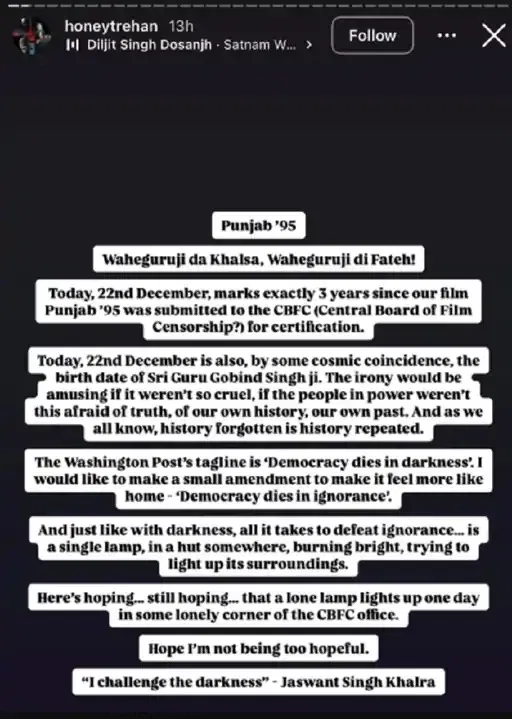 ਹਨੀ ਤ੍ਰੇਹਨ ਨੇ ਸਟੋਰੀ ‘ਤੇ ਲਿਖਿਆ ਸੀ, “ਵਾਹਿਗੁਰੂ ਜੀ ਕਾ ਖਾਲਸਾ, ਵਾਹਿਗੁਰੂ ਜੀ ਕੀ ਫਤਿਹ! ਅੱਜ 22 ਦਸੰਬਰ ਹੈ। ਇਸ ਦਿਨ, ਤਿੰਨ ਸਾਲ ਪਹਿਲਾਂ, ਸਾਡੀ ਫਿਲਮ Punjab 95 ਨੂੰ CBFC(ਸੈਂਸਰ ਬੋਰਡ) ਨੂੰ ਸਰਟੀਫਿਕੇਸ਼ਨ ਲਈ ਜਮ੍ਹਾਂ ਕਰਵਾਇਆ ਗਿਆ ਸੀ। ਅੱਜ, 22 ਦਸੰਬਰ, ਸ਼੍ਰੀ ਗੁਰੂ ਗੋਬਿੰਦ ਸਿੰਘ ਜੀ ਦਾ ਜਨਮ ਦਿਹਾੜਾ ਵੀ ਹੈ। ਇਹ ਸੰਯੋਗ ਸਵਾਗਤਯੋਗ ਹੋ ਸਕਦਾ ਸੀ ਜੇਕਰ ਹਾਲਾਤ ਇੰਨੇ ਕਠੋਰ ਨਾ ਹੁੰਦੇ। ਪਰ ਸੱਚ ਇਹ ਹੈ ਕਿ ਸੱਤਾ ਵਿੱਚ ਬੈਠੇ ਲੋਕ ਸੱਚ ਤੋਂ, ਆਪਣੇ ਇਤਿਹਾਸ ਤੋਂ ਡਰਦੇ ਹਨ। ਜਿਵੇਂ ਕਿ ਅਸੀਂ ਜਾਣਦੇ ਹਾਂ, ਭੁੱਲਿਆ ਹੋਇਆ ਇਤਿਹਾਸ ਦੁਹਰਾਇਆ ਜਾਂਦਾ ਹੈ। ਵਾਸ਼ਿੰਗਟਨ ਪੋਸਟ ਦੀ ਟੈਗਲਾਈਨ ਹੈ – ਲੋਕਤੰਤਰ ਹਨੇਰੇ ਵਿੱਚ ਮਰ ਜਾਂਦਾ ਹੈ। ਮੈਂ ਇਸ ਵਿੱਚ ਇੱਕ ਛੋਟੀ ਜਿਹੀ ਤਬਦੀਲੀ ਕਰਨਾ ਚਾਹੁੰਦਾ ਹਾਂ, ਜੋ ਸਾਡੀ ਸਥਿਤੀ ਲਈ ਵਧੇਰੇ ਢੁਕਵਾਂ ਹੈ।”