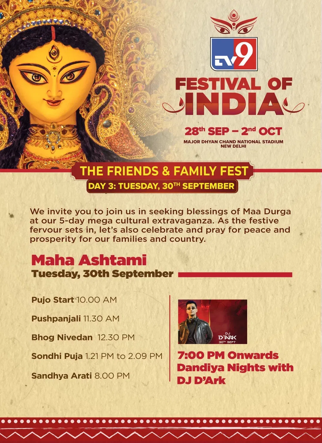 TV9 ਫੈਸਟੀਵਲ ਆਫ਼ ਇੰਡੀਆ 2025 ਦਾ ਖੁਮਾਰ ਲੋਕਾਂ ਦੇ ਸਿਰ ਚੜ੍ਹ ਕੇ ਬੋਲ ਰਿਹਾ ਹੈ। ਇਸ ਪੰਜ-ਦਿਨਾਂ ਤਿਉਹਾਰ ਵਿੱਚ ਭਾਰਤ ਦਾ ਸਭ ਤੋਂ ਉੱਚਾ ਦੁਰਗਾ ਪੂਜਾ ਪੰਡਾਲ, ਵਿਸ਼ਾਲ ਲਾਈਫਸਟਾਈਲ ਐਕਸਪੋ, ਅਤੇ ਕਈ ਸੱਭਿਆਚਾਰਕ ਪ੍ਰੋਗਰਾਮ ਦੇ ਮੁੱਖ ਖਿੱਚ ਦਾ ਕੇਂਦਰ ਬਣੇ ਹੋਏ ਹਨ। ਅੱਜ ਡੀਜੇ DJ DArk ਦੇ ਨਾਲ ਡਾਂਡੀਆ ਡੀਜੇ ਨਾਈਟ ਹੋਵੇਗੀ।