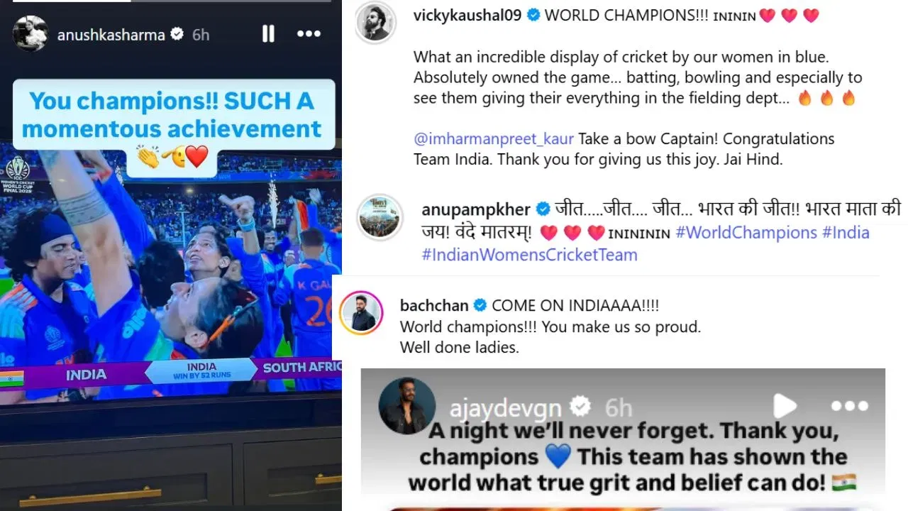 ਅਜੇ ਦੇਵਗਨ ਨੇ ਲਿਖਿਆ, “ਅਸੀਂ ਇਸ ਰਾਤ ਨੂੰ ਕਦੇ ਨਹੀਂ ਭੁੱਲਾਂਗੇ। ਥੈਂਕਯੂ, ਚੈਂਪੀਅਨਸ। ਇਸ ਟੀਮ ਨੇ ਦੁਨੀਆ ਨੂੰ ਦਿਖਾਇਆ ਕਿ ਵਿਸ਼ਵਾਸ ਕੀ ਕਰ ਸਕਦਾ ਹੈ।” ਅਨੁਸ਼ਕਾ ਸ਼ਰਮਾ, ਜੋ ਆਪਣੇ ਪਰਿਵਾਰ ਨਾਲ ਵਿਦੇਸ਼ ਵਿੱਚ ਰਹਿ ਰਹੀ ਹੈ, ਵੀ ਫਾਈਨਲ ਮੈਚ ਦੇਖ ਰਹੀ ਸੀ। ਜਿੱਤ ਤੋਂ ਬਾਅਦ, ਉਨ੍ਹਾਂ ਨੇ ਇੱਕ ਸਟੋਰੀ ਸ਼ੇਅਰ ਕੀਤੀ, “ਦੁਨੀਆ ਦੀਆਂ ਚੈਂਪੀਅਨਜਸ, ਸੁਪਰ ਵੂਮੈਨ ਨੇ ਇਤਿਹਾਸ ਰਚਿਆ ਹੈ। ਲਵ ਯੂ ਗਰਲਸ, ਕੀ ਗੇਮ ਸੀ!”
