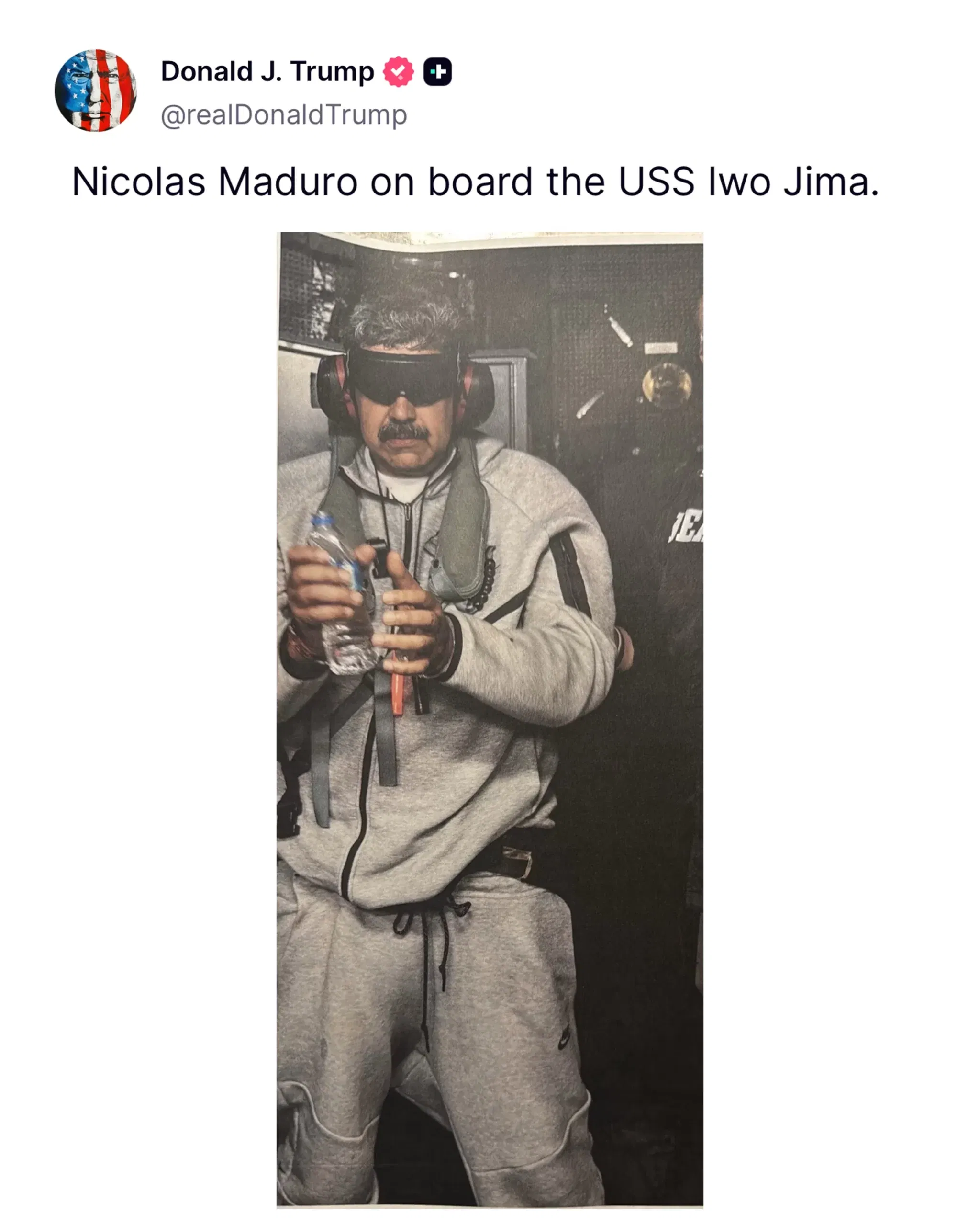 ਵੈਨੇਜ਼ੁਏਲਾ ‘ਤੇ ਹਮਲੇ ਤੋਂ ਬਾਅਦ, ਅਮਰੀਕੀ ਰਾਸ਼ਟਰਪਤੀ ਡੋਨਾਲਡ ਟਰੰਪ ਪ੍ਰੈਸ ਕਾਨਫਰੰਸ ਕਰਕੇ ਸਾਰੀ ਜਾਣਕਾਰੀ ਦੇ ਰਹੇ ਹਨ। ਉਸਤੋਂ ਪਹਿਲਾਂ ਟਰੰਪ ਨੇ ਮਾਦੁਰੋ ਦੀ ਇੱਕ ਤਸਵੀਰ ਸ਼ੇਅਰ ਕੀਤੀ, ਜਿਸ ਵਿੱਚ ਉਨ੍ਹਾਂ ਦੀਆਂ ਅੱਖਾਂ ਤੇ ਪੱਟੀ ਬੰਨ੍ਹੀ ਹੋਈ ਹੈ।