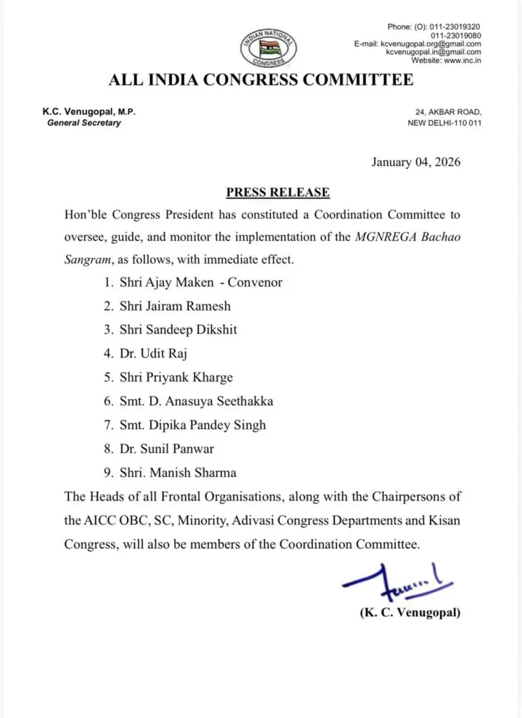 ਕਾਂਗਰਸ ਪਾਰਟੀ ਨੇ ਮਨਰੇਗਾ ਨੂੰ ਲੈ ਕੇ ਅੰਦੋਲਨ ਕਰਨ ਲਈ ਨੌਂ ਲੋਕਾਂ ਦੀ ਇੱਕ ਕਮੇਟੀ ਬਣਾਈ ਹੈ। ਅਜੈ ਮਾਕਨ ਨੂੰ ਕਨਵੀਨਰ ਨਿਯੁਕਤ ਕੀਤਾ ਗਿਆ ਹੈ।