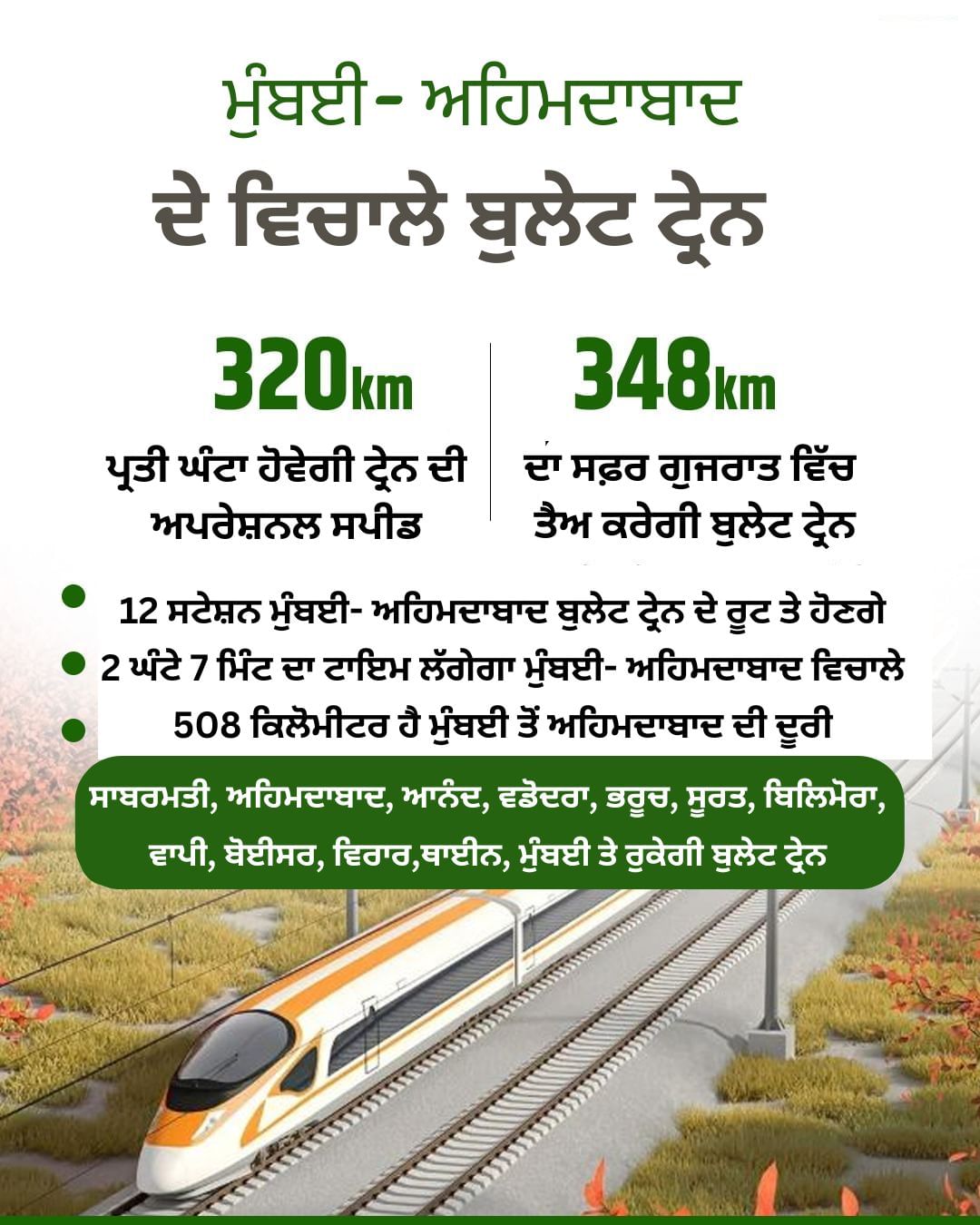 ਮੁੰਬਈ ਅਤੇ ਅਹਿਮਦਾਬਾਦ ਵਿਚਕਾਰ ਚੱਲਣ ਵਾਲੀ ਬੁਲੇਟ ਟ੍ਰੇਨ 12 ਸਟੇਸ਼ਨਾਂ ‘ਤੇ ਰੁਕੇਗੀ। ਇਸ ਵਿੱਚ ਸਾਬਰਮਤੀ, ਅਹਿਮਦਾਬਾਦ, ਆਨੰਦ, ਵਡੋਦਰਾ, ਭਰੂਚ, ਸੂਰਤ, ਬਿਲੀਮੋਰਾ, ਵਾਪੀ, ਬੋਈਸਰ, ਵਿਰਾਰ, ਠਾਣੇ ਅਤੇ ਮੁੰਬਈ ਸ਼ਾਮਲ ਹਨ। 508 ਕਿਲੋਮੀਟਰ ਦੀ ਯਾਤਰਾ ਵਿੱਚ 2 ਘੰਟੇ ਅਤੇ 7 ਮਿੰਟ ਲੱਗਣਗੇ। ਟ੍ਰੇਨ ਦੀ ਸੰਚਾਲਨ ਗਤੀ 320 ਕਿਲੋਮੀਟਰ ਪ੍ਰਤੀ ਘੰਟਾ ਹੋਣ ਦੀ ਉਮੀਦ ਹੈ। ਬੁਲੇਟ ਟ੍ਰੇਨ ਗੁਜਰਾਤ ਵਿੱਚ 348 ਕਿਲੋਮੀਟਰ ਅਤੇ ਮਹਾਰਾਸ਼ਟਰ ਵਿੱਚ 156 ਕਿਲੋਮੀਟਰ ਦੀ ਦੂਰੀ ਤੈਅ ਕਰੇਗੀ।