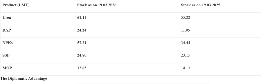 ਭਾਰਤ ਕੋਲ ਪਿਛਲੇ ਸਾਲ ਦੇ ਮੁਕਾਬਲੇ ਇਸ ਸਾਲ ਖਾਦ ਦਾ ਲੋੜੀਂਦਾ ਭੰਡਾਰ ਹੈ। ਯੂਰੀਆ ਅਤੇ ਡੀਏਪੀ ਸਮੇਤ ਸਾਰੀਆਂ ਕਿਸਮਾਂ ਦੀਆਂ ਖਾਦਾਂ ਦਾ ਸਟਾਕ ਪਿਛਲੇ ਸਾਲ ਮਾਰਚ ਵਿੱਚ 138.79 ਐਲਐਮਟੀ ਸੀ, ਜੋ ਇਸ ਸਾਲ ਵੱਧ ਕੇ 180.04 ਐਲਐਮਟੀ ਹੋ ਗਿਆ ਹੈ। ਇਹ ਸਟਾਕ ਪਿਛਲੇ ਸਾਲ 19 ਮਾਰਚ ਦੇ ਮੁਕਾਬਲੇ 29.72 ਪ੍ਰਤੀਸ਼ਤ ਵੱਧ ਹੈ। ਡੀਏਪੀ ਸਟਾਕ ਵੀ ਦੁੱਗਣਾ ਹੋ ਗਿਆ ਹੈ, ਪਿਛਲੇ ਸਾਲ 11.85 ਐਲਐਮਟੀ ਤੋਂ ਇਸ ਸਾਲ 24.24 ਐਲਐਮਟੀ ਹੋ ਗਿਆ ਹੈ।