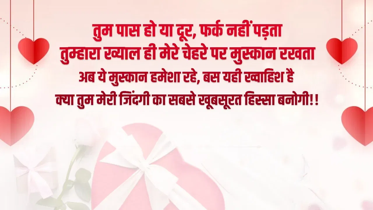 तुम पास हो या दूर, फर्क नहीं पड़ता तुम्हारा ख्याल ही मेरे चेहरे पर मुस्कान रखता अब ये मुस्कान हमेशा रहे, बस यही ख्वाहिश है क्या तुम मेरी जिंदगी का सबसे खूबसूरत हिस्सा बनोगी!!