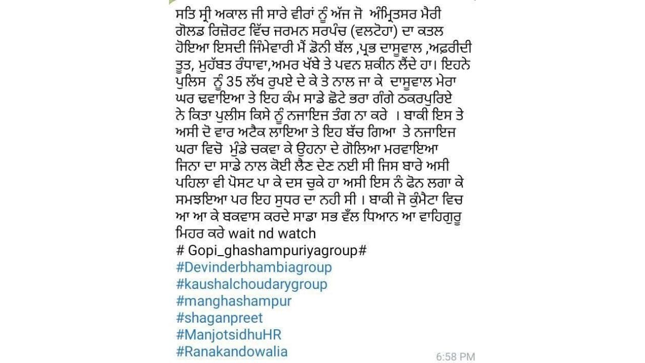 ਇਸ ਕਤਲ ਦੀ ਵਾਰਦਾਤ ਤੋਂ ਬਾਅਦ ਗੈਂਗਸਟਰ ਡੌਨੀ ਬੱਲ ਅਤੇ ਪ੍ਰਭ ਦਾਸੂਵਾਲ ਨੇ ਕੁਝ ਘੰਟਿਆਂ ਬਾਅਦ ਹੀ ਇੱਕ ਸੋਸ਼ਲ ਮੀਡੀਆ ਪੋਸਟ ‘ਤੇ ਜ਼ਿੰਮੇਵਾਰੀ ਲਈ ਸੀ। ਹਾਲਾਂਕਿ, ਟੀਵੀ9 ਪੰਜਾਬੀ ਇਸ ਪੋਸਟ ਦੀ ਪੁਸ਼ਟੀ ਨਹੀਂ ਕਰਦਾ। ਇਸ ਕਤਲਕਾਂਡ ਤੋਂ ਬਾਅਦ ਪੁਲਿਸ ਅਜੇ ਵੀ ਕਈ ਪਹਿਲੂਆਂ ਤੋਂ ਘੋਖ ਕਰ ਰਹੀ ਹੈ। ਪੁਲਿਸ ਵੱਲੋਂ ਇਸ ਸੰਭਾਵਨਾ ਦੀ ਵੀ ਜਾਂਚ ਕੀਤੀ ਜਾ ਰਹੀ ਹੈ ਕਿ ਕਿਸੇ ਨੇ ਨਿੱਜੀ ਰੰਜਿਸ਼ ਨੂੰ ਸੁਲਝਾਉਣ ਲਈ ਗੈਂਗਸਟਰਾਂ ਦੀ ਵਰਤੋਂ ਕੀਤੀ ਹੋ ਸਕਦੀ ਹੈ।
