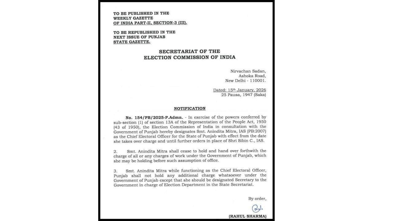 ਚੋਣ ਕਮਿਸ਼ਨ ਨੇ ਪੰਜਾਬ ਲਈ ਨਵੇਂ ਮੁੱਖ ਚੋਣ ਅਧਿਕਾਰੀ ਦੀ ਨਿਯੁਕਤੀ ਦਾ ਐਲਾਨ ਕੀਤਾ ਹੈ। ਪੰਜਾਬ ਕੇਡਰ ਦੀ 2007 ਬੈਚ ਦੀ ਸੀਨੀਅਰ ਆਈਏਐਸ ਅਧਿਕਾਰੀ ਅਨਿੰਦਿਤਾ ਮਿੱਤਰਾ ਨੂੰ ਪੰਜਾਬ ਦੀ ਨਵੀਂ ਮੁੱਖ ਚੋਣ ਅਧਿਕਾਰੀ ਨਿਯੁਕਤ ਕੀਤਾ ਗਿਆ ਹੈ। ਉਹ ਮੌਜੂਦਾ ਮੁੱਖ ਚੋਣ ਅਧਿਕਾਰੀ, ਆਈਏਐਸ ਸਿਬਿਨ ਸੀ. ਦੀ ਥਾਂ ਲੈਣਗੇ, ਜੋ ਕੇਂਦਰੀ ਡੈਪੂਟੇਸ਼ਨ ਕਾਰਨ ਅਹੁਦਾ ਛੱਡ ਰਹੇ ਹਨ।