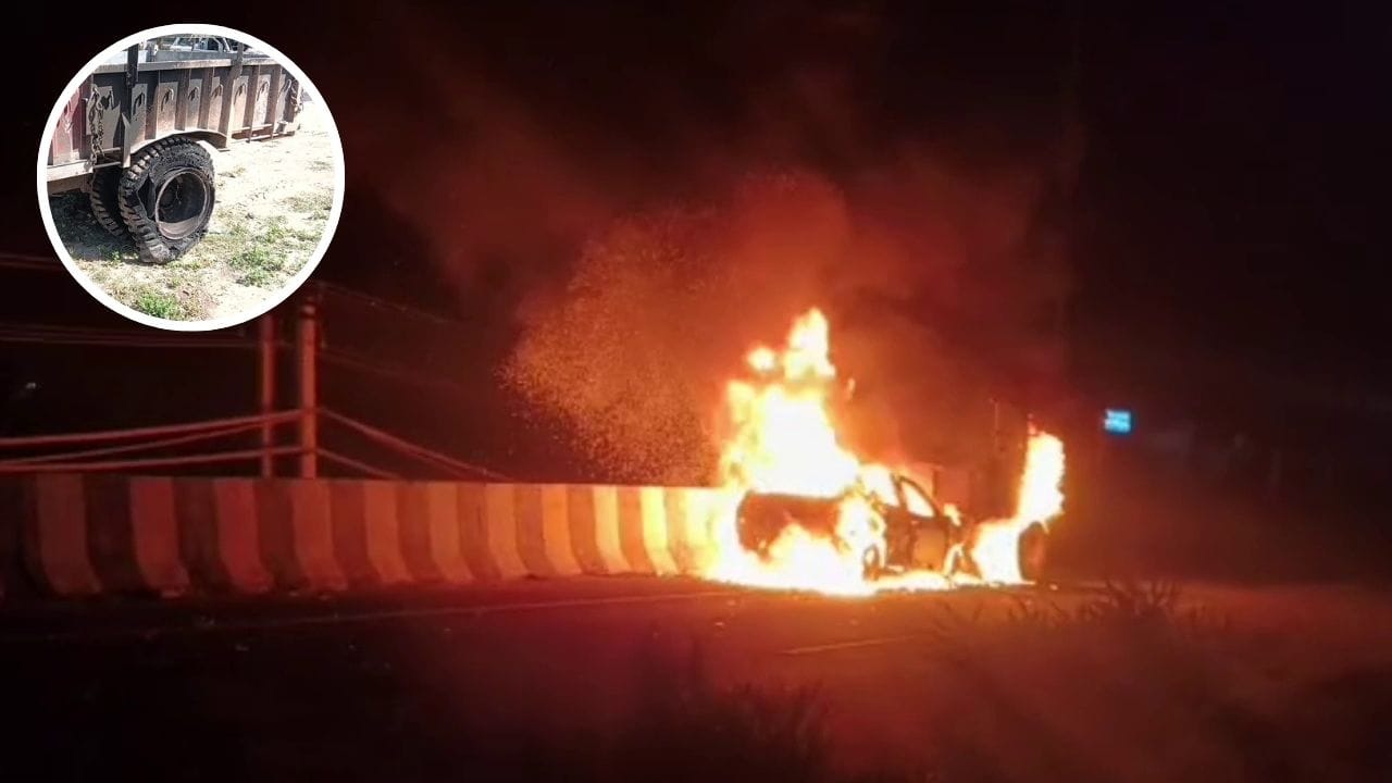 ਟਰੈਕਟਰ ਟਰਾਲੀ ਤੇ ਕਾਰ ਵਿਚਾਲੇ ਟੱਕਰ, ਅੱਗ ਦਾ ਗੋਲਾ ਬਣੀ ਗੱਡੀ; ਬਰਨਾਲਾ-ਬਠਿੰਡਾ NHAI ‘ਤੇ ਵਾਪਰਿਆ ਹਾਦਸਾ
