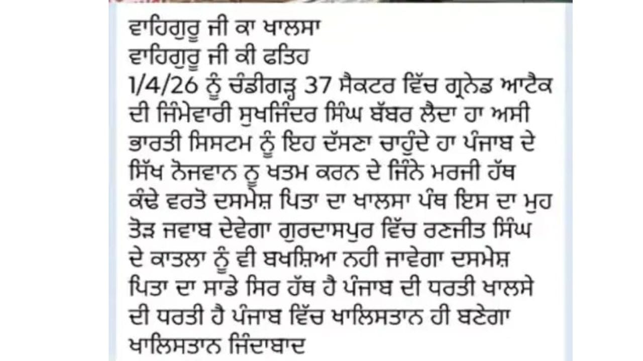 ਇੱਕ ਖਾਲਿਸਤਾਨੀ ਅੱਤਵਾਦੀ ਨੇ ਇਸ ਘਟਨਾ ਦੀ ਜ਼ਿੰਮੇਵਾਰੀ ਲਈ ਹੈ। ਉਸ ਵੱਲੋਂ ਲਿਖਿਆ ਗਿਆ, “ਸੁਖਜਿੰਦਰ ਸਿੰਘ ਬੱਬਰ ਨੇ 1 ਅਪ੍ਰੈਲ, 2026 ਨੂੰ ਸੈਕਟਰ 37, ਚੰਡੀਗੜ੍ਹ ਵਿੱਚ ਹੋਏ ਗ੍ਰਨੇਡ ਹਮਲੇ ਦੀ ਜ਼ਿੰਮੇਵਾਰੀ ਲਈ ਹੈ। ਅਸੀਂ ਭਾਰਤੀ ਸਿਸਟਮ ਨੂੰ ਦੱਸਣਾ ਚਾਹੁੰਦੇ ਹਾਂ ਕਿ ਤੁਸੀਂ ਪੰਜਾਬ ਵਿੱਚ ਸਿੱਖ ਨੌਜਵਾਨਾਂ ਨੂੰ ਖਤਮ ਕਰਨ ਲਈ ਜੋ ਵੀ ਹੱਥਕੰਡੇ ਵਰਤਦੇ ਹੋ, ਦਸਮੇਸ਼ ਪਿਤਾ ਦਾ ਖਾਲਸਾ ਪੰਥ ਢੁਕਵਾਂ ਜਵਾਬ ਦੇਵੇਗਾ।”