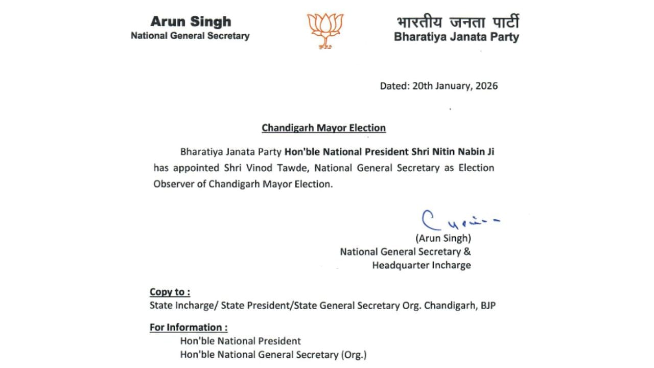 ਭਾਜਪਾ ਨੇ ਚੰਡੀਗੜ੍ਹ ਮੇਅਰ ਦੀ ਚੋਣ ਲਈ ਰਾਸ਼ਟਰੀ ਜਨਰਲ ਸਕੱਤਰ ਵਿਨੋਦ ਤਾਵੜੇ ਨੂੰ ਚੋਣ ਆਬਜ਼ਰਵਰ ਨਿਯੁਕਤ ਕੀਤਾ ਹੈ। ਇਸ ਤੋਂ ਸਪੱਸ਼ਟ ਹੁੰਦਾ ਹੈ ਕਿ ਪਾਰਟੀ ਇਸ ਚੋਣ ਨੂੰ ਬਹੁਤ ਮਹੱਤਵਪੂਰਨ ਮੰਨਦੀ ਹੈ ਅਤੇ ਰਣਨੀਤੀਆਂ ਸਿਖਰਲੀ ਲੀਡਰਸ਼ਿਪ ਦੀ ਸਿੱਧੀ ਨਿਗਰਾਨੀ ਹੇਠ ਤਿਆਰ ਕੀਤੀਆਂ ਜਾਣਗੀਆਂ।