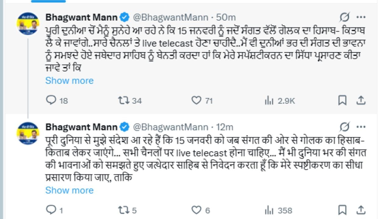 ਪੰਜਾਬ ਦੇ ਮੁੱਖ ਮੰਤਰੀ ਭਗਵੰਤ ਮਾਨ ਨੇ ਸ੍ਰੀ ਅਕਾਲ ਤਖ਼ਤ ਦੇ ਜਥੇਦਾਰ ਗਿਆਨੀ ਕੁਲਦੀਪ ਸਿੰਘ ਗੜਗੱਜ ਨੂੰ ਅਪੀਲ ਕੀਤੀ ਕਿ 15 ਜਨਵਰੀ ਨੂੰ ਜਦੋਂ ਉਹ ਅਕਾਲ ਤਖ਼ਤ ‘ਤੇ ਪੇਸ਼ ਹੋਣ ਤਾਂ ਉਸਦਾ ਸਾਰੇ ਚੈਨਲਾਂ ਤੇ ਲਾਈਵ ਪ੍ਰਸਾਰਣ ਕੀਤਾ ਜਾਵੇ। ਮਾਨ ਨੇ ਸੋਸ਼ਲ ਮੀਡੀਆ ‘ਤੇ ਲਿਖਿਆ, “ਮੈਨੂੰ ਦੁਨੀਆ ਭਰ ਤੋਂ ਸੰਦੇਸ਼ ਮਿਲ ਰਹੇ ਹਨ ਕਿ ਜਦੋਂ ਤੁਸੀਂ 15 ਜਨਵਰੀ ਨੂੰ ਸੰਗਤ ਵੱਲੋਂ ਗੋਲਕ ਦਾ ਹਿਸਾਬ ਕਿਤਾਬ ਲੈਕੇ ਜਾਵੋਗੇ ਤਾਂ ਇਸਦਾ ਲਾਈਵ ਟੈਲੀਕਾਸਟ ਹੋਣਾ ਚਾਹੀਦਾ ਹੈ।”