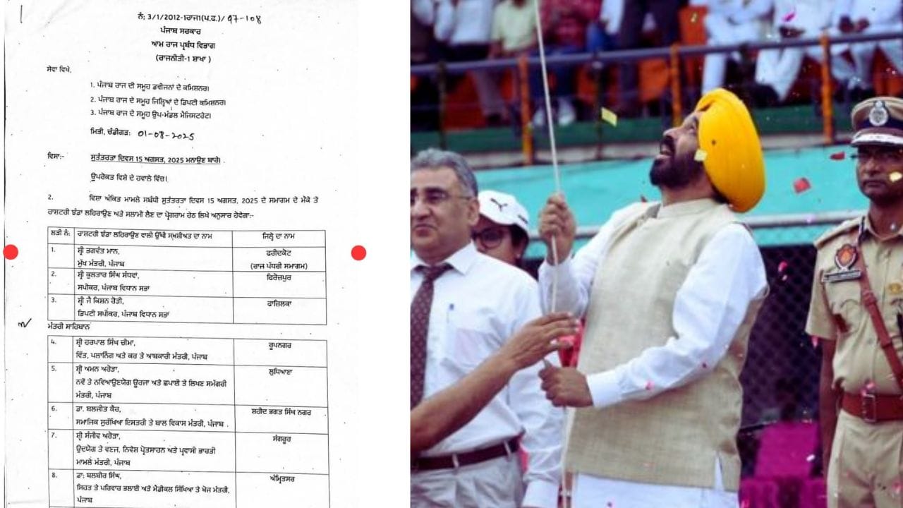 ਮੰਤਰੀ ਲਾਲਜੀਤ ਸਿੰਘ ਭੁੱਲਰ ਮਾਨਸਾ ਵਿੱਚ ਤਿਰੰਗਾ ਲਹਿਰਾਉਣਗੇ, ਹਰਜੋਤ ਬੈਂਸ ਮੋਗਾ ਵਿੱਚ, ਬਰਿੰਦਰ ਗੋਇਲ ਬਠਿੰਡਾ ਵਿੱਚ ਅਤੇ ਤਰੁਣਪ੍ਰੀਤ ਸੇਂਧ ਜਲੰਧਰ ਵਿੱਚ। ਮੰਤਰੀ ਰਵਜੋਤ ਸਿੰਘ ਪਠਾਨਕੋਟ ਵਿੱਚ, ਗੁਰਮੀਤ ਸਿੰਘ ਖੁੱਡੀਆਂ ਮੋਹਾਲੀ ਵਿੱਚ, ਮਹਿੰਦਰ ਭਗਤ ਹੁਸ਼ਿਆਰਪੁਰ ਵਿੱਚ ਅਤੇ ਹਰਭਜਨ ਸਿੰਘ ਈਟੀਓ ਪਟਿਆਲਾ ਵਿੱਚ ਤਿਰੰਗਾ ਲਹਿਰਾਉਣਗੇ।