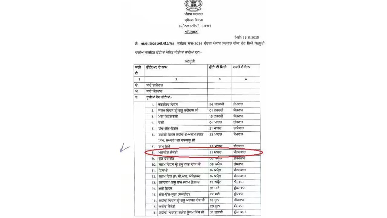 ਇਸ ਦਿਨ ਸੂਬੇ ‘ਚ ਸਰਕਾਰੀ ਛੁੱਟੀ ਰਹੇਗੀ ਅਤੇ ਸਾਰੇ ਸਕੂਲ, ਕਾਲਜ ਅਤੇ ਸਰਕਾਰੀ ਅਦਾਰੇ ਬੰਦ ਰਹਿਣਗੇ। ਇਸ ਤੋਂ ਪਹਿਲਾਂ 26 ਮਾਰਚ ਦਿਨ ਵੀਰਵਾਰ ਨੂੰ ਵੀ ਰਾਮਨੌਮੀ ਦੇ ਤਿਉਹਾਰ ਕਾਰਨ ਸੂਬੇ ‘ਚ ਸਰਕਾਰੀ ਛੁੱਟੀ ਐਲਾਨੀ ਗਈ ਸੀ। ਹੁਣ ਫਿਰ 31 ਮਾਰਚ ਨੂੰ ਇੱਕ ਹੋਰ ਸਰਕਾਰੀ ਛੁੱਟੀ ਆ ਗਈ ਹੈ। ਇਸ ਦਿਨ ਸੂਬੇ ਦੇ ਸਾਰੇ ਸਕੂਲ, ਕਾਲਜ ਅਤੇ ਸਰਕਾਰੀ ਦਫ਼ਤਰ ਬੰਦ ਰਹਿਣਗੇ। ਦਰਅਸਲ ਪੰਜਾਬ ਸਰਕਾਰ ਦੇ ਕੈਲੰਡਰ ਮੁਤਾਬਕ 31 ਮਾਰਚ ਦਿਨ ਮੰਗਲਵਾਰ ਨੂੰ ਮਹਾਂਵਾਰੀ ਜੈਯੰਤੀ ਮਨਾਈ ਜਾ ਰਹੀ ਹੈ।