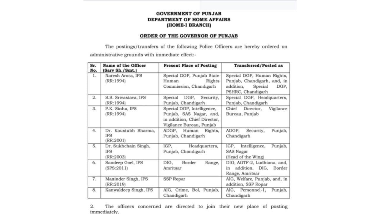 ਇੱਕ ਸਰਕਾਰੀ ਨੋਟੀਫਿਕੇਸ਼ਨ ਦੇ ਅਨੁਸਾਰ, 2003 ਬੈਚ ਦੇ ਆਈਪੀਐਸ ਅਧਿਕਾਰੀ ਡਾ. ਸੁਖਚੈਨ ਸਿੰਘ, ਆਈਜੀ ਹੈੱਡਕੁਆਰਟਰ ਨੂੰ ਆਈਜੀਪੀ ਇੰਟੈਲੀਜੈਂਸ, ਮੋਹਾਲੀ ਦਾ ਚਾਰਜ ਦਿੱਤਾ ਗਿਆ ਹੈ। 1994 ਬੈਚ ਦੇ ਆਈਪੀਐਸ ਅਧਿਕਾਰੀ ਐਸਐਸ ਸ੍ਰੀਵਾਸਤਵ ਨੂੰ ਸਪੈਸ਼ਲ ਡੀਜੀਪੀ ਹੈੱਡਕੁਆਰਟਰ ਨਿਯੁਕਤ ਕੀਤਾ ਗਿਆ ਹੈ। ਇਸ ਦੌਰਾਨ, ਮਨਿੰਦਰ ਸਿੰਘ, ਏਆਈਜੀ ਵੈਲਫੇਅਰ, ਪੰਜਾਬ ਅਤੇ ਐਡੀਸ਼ਨਲ ਐਸਐਸਪੀ, ਰੋਪੜ, ਜੋ ਕਿ 2019 ਬੈਚ ਦੇ ਆਈਪੀਐਸ ਅਧਿਕਾਰੀ ਹਨ। ਉਨ੍ਹਾਂ ਨੂੰ ਐਸਐਸਪੀ, ਰੋਪੜ ਦਾ ਚਾਰਜ ਦਿੱਤਾ ਗਿਆ ਹੈ।