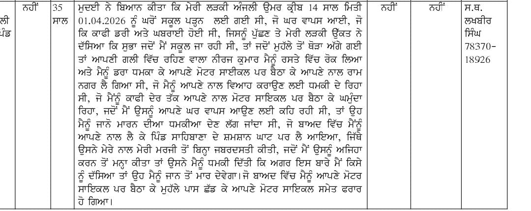 ਇਹ ਘਟਨਾ 1 ਅਪ੍ਰੈਲ ਦੀ ਸਵੇਰ ਨੂੰ ਵਾਪਰੀ, ਜਦੋਂ ਸਾਹਿਬਾਨਾ ਇਲਾਕੇ ਦੀ ਰਹਿਣ ਵਾਲੀ ਵਿਦਿਆਰਥਣ ਆਮ ਵਾਂਗ ਸਕੂਲ ਲਈ ਨਿਕਲੀ। ਜਿਵੇਂ ਹੀ ਉਹ ਆਪਣੇ ਘਰ ਤੋਂ ਥੋੜ੍ਹੀ ਦੂਰੀ ‘ਤੇ ਪਹੁੰਚੀ, ਉਸੇ ਮੁਹੱਲੇ ਦੇ ਰਹਿਣ ਵਾਲੇ ਨੀਰਜ ਕੁਮਾਰ (35) ਨੇ ਉਸ ਨੂੰ ਰਸਤੇ’ਚ ਰੋਕ ਲਿਆ। ਮੁਲਜ਼ਮ ਨੇ ਨਾਬਾਲਗ ਨੂੰ ਜਾਨੋਂ ਮਾਰਨ ਦੀ ਧਮਕੀ ਦਿੱਤੀ ਤੇ ਜ਼ਬਰਦਸਤੀ ਆਪਣੇ ਮੋਟਰਸਾਈਕਲ ‘ਤੇ ਬਿਠਾ ਲਿਆ। ਧਮਕੀਆਂ ਦੇ ਕੇ ਡਰਾ-ਧਮਕਾ ਕੇ, ਮੁਲਜ਼ਮ ਉਸ ਨੂੰ ਰਾਮ ਨਗਰ ਦੀ ਦਿਸ਼ਾ ‘ਚ ਲੈ ਗਿਆ।