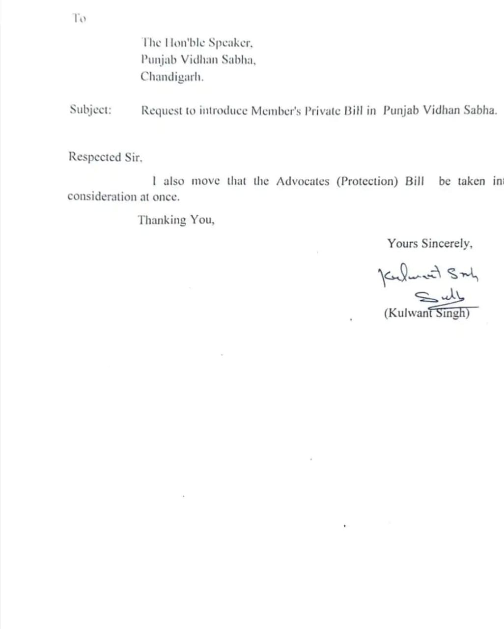 ਆਤਮ ਨਗਰ ਹਲਕੇ ਤੋਂ ਵਿਧਾਇਕ ਕੁਲਵੰਤ ਸਿੰਘ ਸਿੱਧੂ ਨੇ ਕਿਹਾ ਕਿ ਉਨ੍ਹਾਂ ਨੇ ਵਿਧਾਨ ਸਭਾ ਦੇ ਸਪੀਕਰ ਨੂੰ ਇੱਕ ਪੱਤਰ ਸੌਂਪਿਆ ਹੈ। ਜੇਕਰ ਉਹ ਇਜਾਜ਼ਤ ਦਿੰਦੇ ਹਨ, ਤਾਂ ਉਹ ਆਉਣ ਵਾਲੇ ਸੈਸ਼ਨ ਵਿੱਚ ਐਡਵੋਕੇਟ ਸੁਰੱਖਿਆ ਬਿੱਲ ਪੇਸ਼ ਕਰਨਗੇ। ਉਨ੍ਹਾਂ ਕਿਹਾ ਕਿ ਖਰੜਾ ਲਗਭਗ ਤਿਆਰ ਹੈ। ਸਪੀਕਰ ਦੀ ਪ੍ਰਵਾਨਗੀ ਮਿਲਣ ਤੋਂ ਬਾਅਦ ਬਿੱਲ ਪੇਸ਼ ਕੀਤਾ ਜਾਵੇਗਾ।