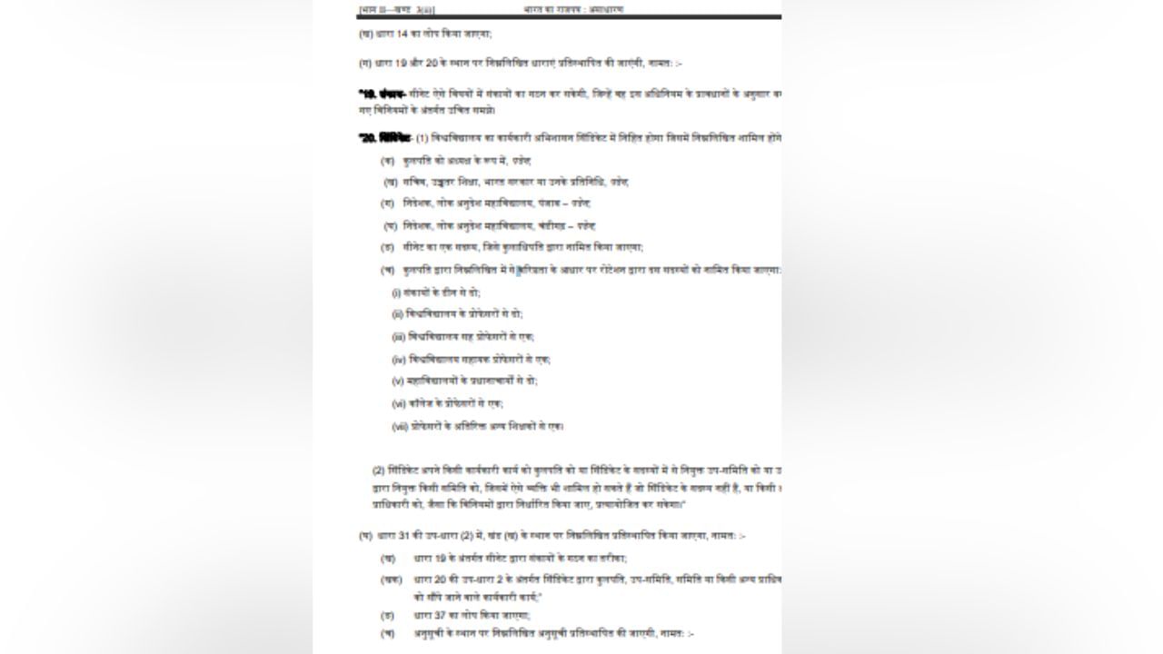 - ਸੈਨੇਟ ਦੀ ਗਿਣਤੀ 91 ਤੋਂ ਘਟਾ ਕੇ 31 ਕਰ ਦਿੱਤੀ ਗਈ ਹੈ, ਅਤੇ ਸਿੰਡੀਕੇਟ ਦੀ ਗਿਣਤੀ 27 ਤੋਂ ਘਟਾ ਕੇ 17 ਕਰ ਦਿੱਤੀ ਗਈ ਹੈ।