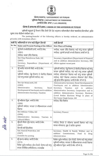 ਪੰਜਾਬ ‘ਚ ਵੱਡਾ 20 IAS ‘ਤੇ 6 PCS ਅਧਿਕਾਰੀਆਂ ਦਾ ਤਬਾਦਲਾ, ਵਿਮਲ ਸੇਤੀਆ ਗ੍ਰਹਿ ਵਿਭਾਗ ਦੇ ਸਕੱਤਰ ਨਿਯੁਕਤ