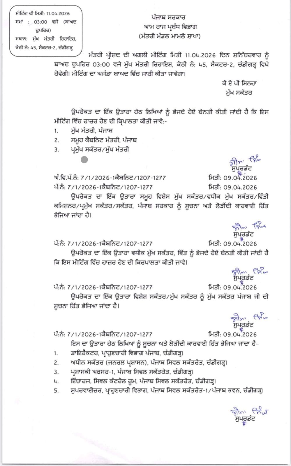 ਪੰਜਾਬ ਸਰਕਾਰ ਨੇ 11 ਅਪ੍ਰੈਲ ਨੂੰ ਬੁਲਾਈ ਕੈਬਨਿਟ ਮੀਟਿੰਗ, ਵਿਸ਼ੇਸ਼ ਸੈਸ਼ਨ ਨੂੰ ਲੈ ਕੇ ਬਣਾਈ ਜਾਵੇਗੀ ਰਣਨੀਤੀ