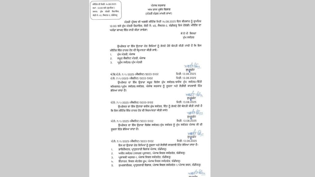 Punjab Cabinet Meeting: ਪੰਜਾਬ ਦੇ ਮੁੱਖ ਮੰਤਰੀ ਭਗਵੰਤ ਮਾਨ ਨੇ ਆਜ਼ਾਦੀ ਦਿਹਾੜੇ ਤੋਂ ਪਹਿਲਾਂ ਕੈਬਨਿਟ ਮੀਟਿੰਗ ਬੁਲਾਈ ਹੈ। ਕੈਬਨਿਟ ਮੀਟਿੰਗ ਵੀਰਵਾਰ ਨੂੰ ਚੰਡੀਗੜ੍ਹ ਸਥਿਤ ਮੁੱਖ ਮੰਤਰੀ ਰਿਹਾਇਸ਼ ‘ਤੇ ਦੁਪਹਿਰ 12 ਵਜੇ ਹੋਵੇਗੀ। ਮੀਟਿੰਗ ਵਿੱਚ ਕਈ ਏਜੰਡਿਆਂ ‘ਤੇ ਚਰਚਾ ਕੀਤੀ ਜਾਵੇਗੀ। ਪਰ ਮੀਟਿੰਗ ਦੇ ਇਹ ਏਜੰਡੇ ਹਾਲੇ ਜਾਰੀ ਨਹੀਂ ਕੀਤੇ ਗਏ ਹਨ।