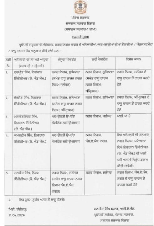 ਪੰਜਾਬ ਵਿੱਚ ਪ੍ਰਸ਼ਾਸਨਿਕ ਕੰਮਕਾਜ ਨੂੰ ਲੈ ਕੇ ਇੱਕ ਅਹਿਮ ਖ਼ਬਰ ਸਾਹਮਣੇ ਆਈ ਹੈ। ਸਥਾਨਕ ਸਰਕਾਰਾਂ ਵਿਭਾਗ ਨੇ ਐਤਵਾਰ ਨੂੰ ਛੁੱਟੀ ਵਾਲੇ ਦਿਨ ਨਗਰ ਨਿਗਮ ਕੇਡਰ ਦੇ ਮੁਲਾਜ਼ਮਾਂ ਅਤੇ ਅਧਿਕਾਰੀਆਂ ਦੇ ਤਬਾਦਲਿਆਂ ਅਤੇ ਨਵੀਂਆਂ ਤਾਇਨਾਤੀਆਂ ਦੇ ਆਦੇਸ਼ ਜਾਰੀ ਕਰਕੇ ਸਭ ਨੂੰ ਹੈਰਾਨ ਕਰ ਦਿੱਤਾ। ਵਿਭਾਗ ਵੱਲੋਂ ਜਾਰੀ ਇਨ੍ਹਾਂ ਹੁਕਮਾਂ ਵਿੱਚ ਕਈ ਕਰਮਚਾਰੀਆਂ ਨੂੰ ਉਨ੍ਹਾਂ ਦੇ ਵਾਧੂ ਚਾਰਜਾਂ ਤੋਂ ਫਾਰਗ ਕਰ ਦਿੱਤਾ ਗਿਆ ਹੈ, ਜਦੋਂ ਕਿ ਤਰੱਕੀ ਪ੍ਰਾਪਤ ਕਰਨ ਵਾਲੇ ਕੁਝ ਅਧਿਕਾਰੀਆਂ ਨੂੰ ਨਵੀਂਆਂ ਜ਼ਿੰਮੇਵਾਰੀਆਂ ਸੌਂਪੀਆਂ ਗਈਆਂ ਹਨ।
