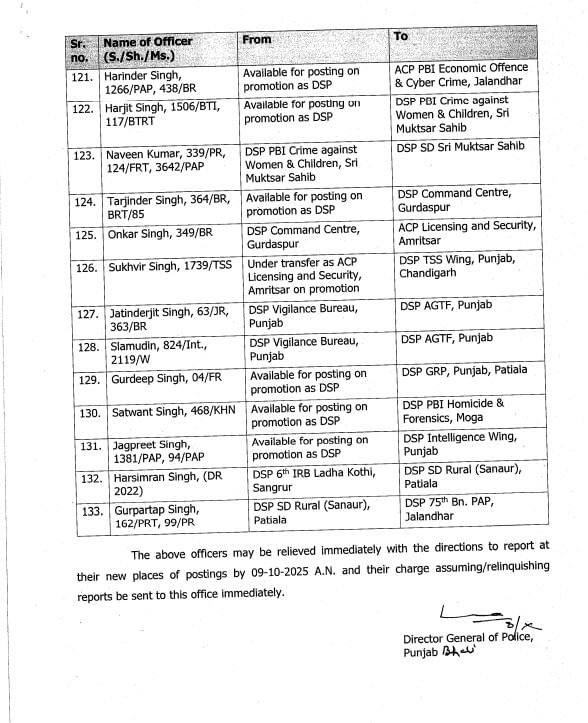 ਇਸ ਤੋਂ ਪਹਿਲਾਂ ਦੁਪਹਿਰ 133 ਅਧਿਕਾਰੀਆਂ ਦੇ ਤਬਾਦਲੇ ਕੀਤੇ ਗਏ, ਜਿਨ੍ਹਾਂ ਵਿੱਚ ਏਐਸਪੀ ਅਤੇ ਡੀਐਸਪੀ ਰੈਂਕ ਦੇ ਅਧਿਕਾਰੀ ਸ਼ਾਮਲ ਸਨ। ਨਿਯੁਕਤ ਕੀਤੇ ਗਏ ਅਧਿਕਾਰੀ ਲੰਬੇ ਸਮੇਂ ਤੋਂ ਪੋਸਟਿੰਗ ਦੀ ਉਡੀਕ ਕਰ ਰਹੇ ਸਨ। ਉਨ੍ਹਾਂ ਨੂੰ ਵਿਜੀਲੈਂਸ ਬਿਊਰੋ ਅਤੇ ਰੋਡ ਸੇਫਟੀ ਫੋਰਸ ਸਮੇਤ ਵੱਖ-ਵੱਖ ਵਿੰਗਾਂ ਵਿੱਚ ਤਾਇਨਾਤ ਕੀਤਾ ਗਿਆ ਸੀ।