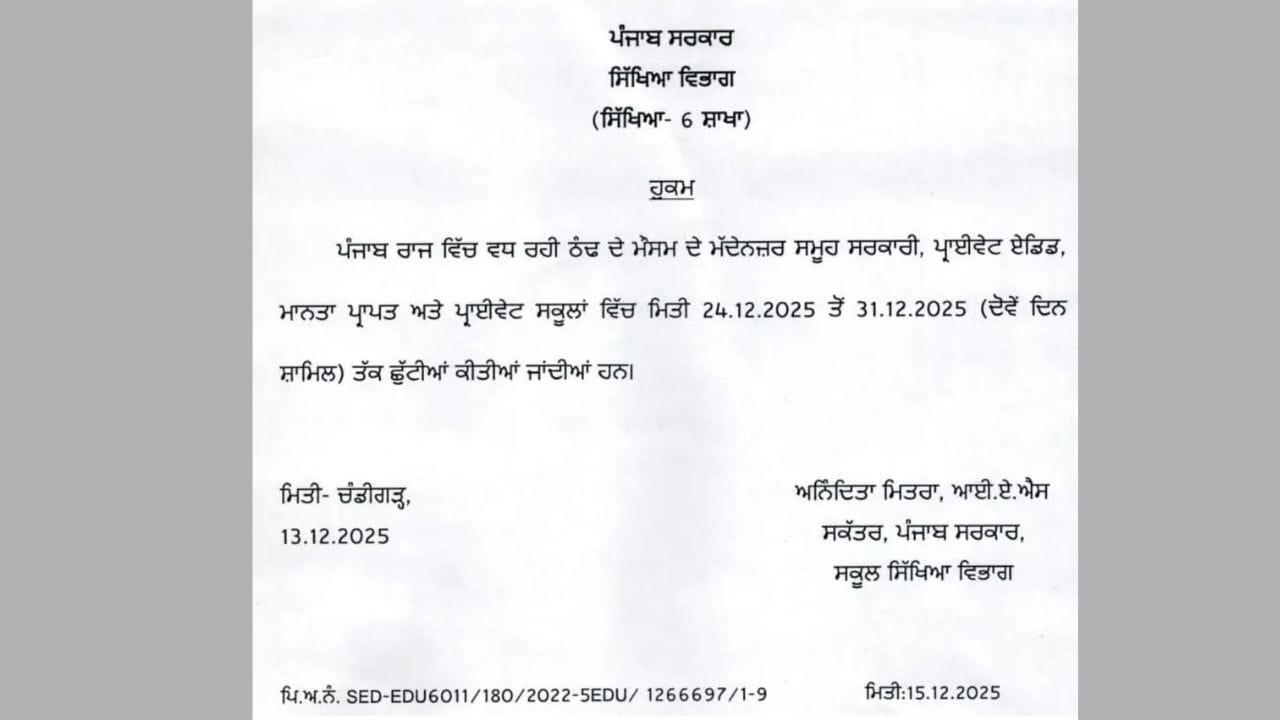 Punjab schools Winter vacations: ਪੰਜਾਬ ਸਰਕਾਰ ਨੇ ਸਕੂਲਾਂ ਲਈ ਸਰਦੀਆਂ ਦੀਆਂ ਛੁੱਟੀਆਂ ਦਾ ਐਲਾਨ ਕਰ ਦਿੱਤਾ ਹੈ। ਸਰਕਾਰੀ ਹੁਕਮਾਂ ਮੁਤਾਬਕ, ਸਕੂਲ 24 ਦਸੰਬਰ ਤੋਂ 31 ਦਸੰਬਰ ਤੱਕ ਬੰਦ ਰਹਿਣਗੇ। ਪੰਜਾਬ ਸਰਕਾਰ ਦੇ ਸਕੂਲ ਸਿੱਖਿਆ ਵਿਭਾਗ ਦੀ ਸਕੱਤਰ ਅਨਿੰਦਿਤਾ ਮਿੱਤਰਾ ਦੇ ਅਨੁਸਾਰ, ਇਹ ਹੁਕਮ ਸਾਰੇ ਸਰਕਾਰੀ ਸਕੂਲਾਂ ਦੇ ਨਾਲ-ਨਾਲ ਪ੍ਰਾਈਵੇਟ ਸਹਾਇਤਾ ਪ੍ਰਾਪਤ, ਮਾਨਤਾ ਪ੍ਰਾਪਤ ਅਤੇ ਪ੍ਰਾਈਵੇਟ ਸਕੂਲਾਂ 'ਤੇ ਲਾਗੂ ਹੁੰਦਾ ਹੈ। ਸਕੂਲ 1 ਜਨਵਰੀ ਨੂੰ ਦੁਬਾਰਾ ਖੁੱਲ੍ਹਣਗੇ।