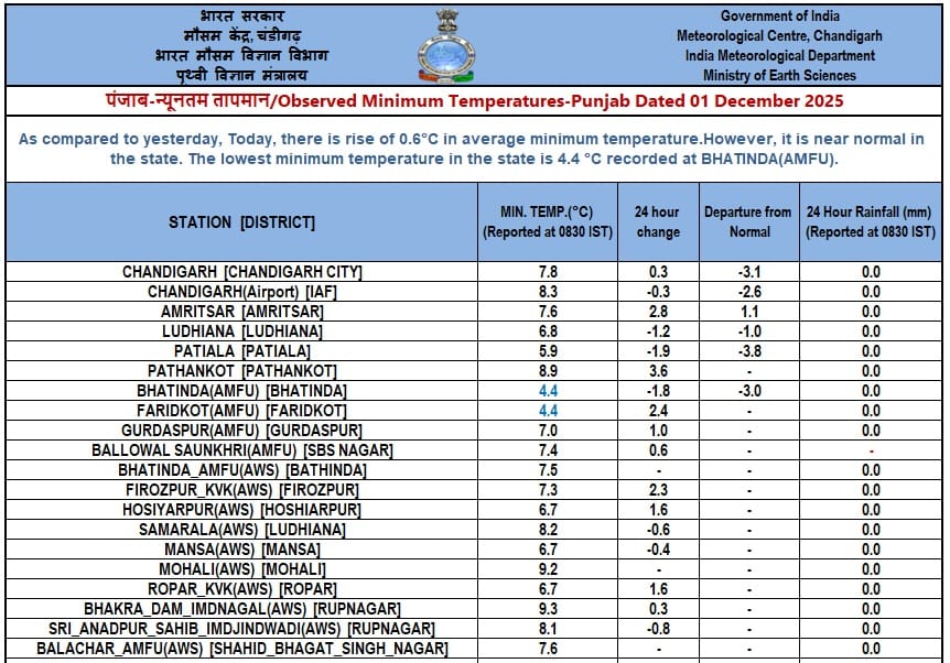 ਬੀਤੇ ਦਿਨ ਜਿੱਥੇ ਬਠਿੰਡਾ ਤੇ ਫਰੀਦਕੋਟ ‘ਚ ਘੱਟੋ-ਘੱਟ ਤਾਪਮਾਨ 4.4 ਡਿਗਰੀ ਦਰਜ ਕੀਤਾ ਗਿਆ। ਉੱਥੇ ਹੀ ਅੰਮ੍ਰਿਤਸਰ ਦਾ ਘੱਟੋ-ਘੱਟ ਤਾਪਮਾਨ 7.6 ਡਿਗਰੀ, ਲੁਧਿਆਣਾ ਦਾ 6.8 ਡਿਗਰੀ, ਪਟਿਆਲਾ ਦਾ 5.9 ਡਿਗਰੀ, ਪਠਾਨਕੋਟ ਦਾ 8.9 ਡਿਗਰੀ, ਗੁਰਦਾਸਪੁਰ ਦਾ 7 ਡਿਗਰੀ, ਬੱਲੋਵਾਲ ਸੌਂਖੜੀ ਦਾ 7.4 ਡਿਗਰੀ, ਫਿਰੋਜ਼ਪੁਰ ਦਾ 7.3 ਡਿਗਰੀ ਦਰਜ ਕੀਤਾ ਗਿਆ।