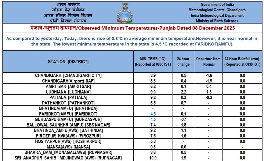ਚੰਡੀਗੜ੍ਹ ਸ਼ਹਿਰ ਦਾ ਘੱਟੋ-ਘੱਟ ਤਾਪਮਾਨ 8.9 ਡਿਗਰੀ ਤੇ ਚੰਡੀਗੜ੍ਹ (ਏਅਪੋਰਟ) ਦਾ ਘੱਟੋ-ਘੱਟ ਤਾਪਮਾਨ 8.6 ਡਿਗਰੀ ਦਰਜ ਕੀਤਾ ਗਿਆ।