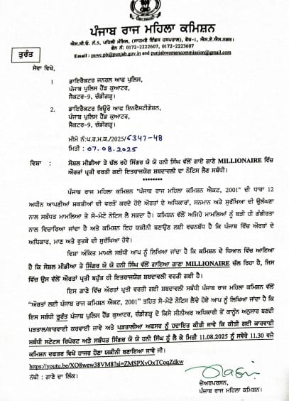 ਪੱਤਰ ‘ਚ ਲਿਖਿਆ ਗਿਆ ਹੈ- ਪੰਜਾਬ ਰਾਜ ਮਹਿਲਾ ਕਮਿਸ਼ਨ ‘ਪੰਜਾਬ ਰਾਜ ਮਹਿਲਾ ਕਮਿਸ਼ਨ ਐਕਟ, 2001 ਦੀ ਧਾਰਾ 12 ਅਧੀਨ ਆਪਣੀਆਂ ਸ਼ਕਤੀਆਂ ਦੀ ਵਰਤੋਂ ਕਰਦੇ ਹੋਏ ਔਰਤਾਂ ਦੇ ਅਧਿਕਾਰਾਂ, ਸਨਮਾਨ ਅਤੇ ਸੁਰੱਖਿਆ ਦੀ ਉਲੰਘਣਾ ਨਾਲ ਸਬੰਧਤ ਮਾਮਲਿਆ ਤੇ ਸੋ-ਮੋਟੋ ਨੋਟਿਸ ਲੈ ਸਕਦਾ ਹੈ। ਕਮਿਸ਼ਨ ਵੱਲੋਂ ਅਜਿਹੇ ਮਾਮਲਿਆਂ ਨੂੰ ਬੜੀ ਹੀ ਗੰਭੀਰਤਾ ਨਾਲ ਵਿਚਾਰਿਆ ਜਾਂਦਾ ਹੈ ਤੇ ਕਮਿਸ਼ਨ ਇਹ ਯਕੀਨੀ ਬਣਾਉਣ ਲਈ ਵਚਨਬੱਧ ਹੈ ਕਿ ਪੰਜਾਬ ‘ਚ ਔਰਤਾਂ ਦੇ ਅਧਿਕਾਰ, ਮਾਣ ਤੇ ਰੁਤਬੇ ਦੀ ਸੁਰੱਖਿਆ ਹੋਵੇ।