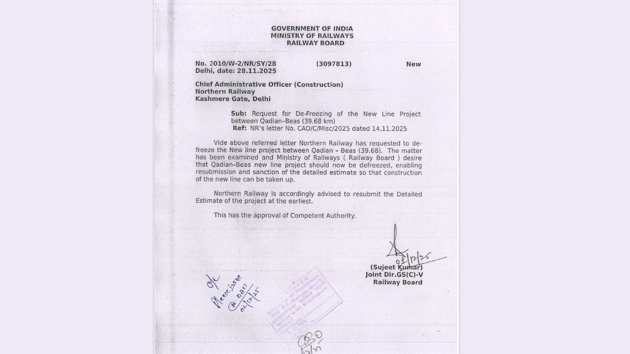 ਉੱਤਰੀ ਰੇਲਵੇ ਦੇ ਮੁੱਖ ਪ੍ਰਸ਼ਾਸਕੀ ਅਫ਼ਸਰ (ਨਿਰਮਾਣ) ਵੱਲੋਂ ਜਾਰੀ ਪੱਤਰ ਵਿੱਚ ਕਿਹਾ ਗਿਆ ਹੈ ਕਿ ਰੇਲਵੇ ਬੋਰਡ ਦੀ ਇੱਛਾ ਹੈ ਕਿ ਕਾਦੀਆਂ-ਬਿਆਸ ਲਾਈਨ ਨੂੰ ਡੀਫ੍ਰੀਜ਼ ਕੀਤਾ ਜਾਵੇ ਅਤੇ ਵਿਸਤ੍ਰਿਤ ਅਨੁਮਾਨ ਜਲਦੀ ਮੁੜ ਜਮ੍ਹਾਂ ਕਰਵਾ ਕੇ ਮਨਜ਼ੂਰ ਕਰਵਾਇਆ ਜਾਵੇ ਤਾਂ ਜੋ ਨਿਰਮਾਣ ਕਾਰਜ ਸ਼ੁਰੂ ਕੀਤਾ ਜਾ ਸਕੇ।