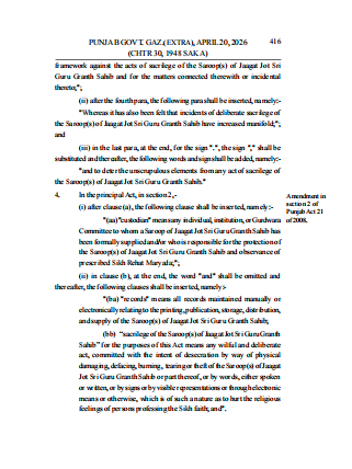 ਪੰਜਾਬ ਸਰਕਾਰ ਦੇ ਬੇਅਦਬੀ ਕਾਨੂੰਨ ਵਿੱਚ ਘੱਟੋ-ਘੱਟ 10 ਸਾਲ ਤੋਂ ਲੈ ਕੇ ਉਮਰ ਕੈਦ ਤੱਕ ਦੀ ਸਜ਼ਾ ਦੀ ਵਿਵਸਥਾ ਹੈ। ਜੁਰਮਾਨਾ ₹500,000 ਤੋਂ ₹2.5 ਮਿਲੀਅਨ ਤੱਕ ਹੋ ਸਕਦਾ ਹੈ। ਹਾਲਾਂਕਿ, ਇਸ ਕਾਨੂੰਨ ਤਹਿਤ ਦਰਜ ਮਾਮਲੇ ਗੈਰ-ਜ਼ਮਾਨਤੀ ਹਨ। ਸਰਕਾਰ ਨੇ 13 ਅਪ੍ਰੈਲ ਨੂੰ ਇੱਕ ਪ੍ਰਸਤਾਵ ਪੇਸ਼ ਕੀਤਾ। ਜਿਸ ਤੋਂ ਬਾਅਦ ਰਾਜਪਾਲ ਨੇ ਇਸ ਨੂੰ ਮਨਜ਼ੂਰੀ ਦੇ ਦਿੱਤੀ।