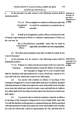 ਪੰਜਾਬ ਸਰਕਾਰ ਨੇ ਬੇਅਦਬੀ ਨਾਲ ਸਬੰਧਤ ਸਖ਼ਤ ਕਾਨੂੰਨਾਂ ਬਾਰੇ ਨੋਟੀਫਿਕੇਸ਼ਨ ਜਾਰੀ ਕੀਤਾ ਹੈ। ਇਨ੍ਹਾਂ ਕਾਨੂੰਨਾਂ ਦੀ ਉਲੰਘਣਾ ਕਰਨ ‘ਤੇ ਹੁਣ ਸਖ਼ਤ ਸਜ਼ਾ ਹੋਵੇਗੀ। ਜਿਸ ਵਿੱਚ ਉਮਰ ਕੈਦ ਤੋਂ ਲੈ ਕੇ 25 ਲੱਖ ਰੁਪਏ ਤੱਕ ਦਾ ਜੁਰਮਾਨਾ ਸ਼ਾਮਲ ਹੈ। ਪਹਿਲਾਂ, ਪੰਜਾਬ ਪੁਲਿਸ ਨੇ ਇਸ ਮਾਮਲੇ ਦੀ ਜਾਂਚ ਲਈ ਇੱਕ ਨਵੀਂ ਸਟੈਂਡਰਡ ਓਪਰੇਟਿੰਗ ਪ੍ਰਕਿਰਿਆ (SOP) ਜਾਰੀ ਕੀਤੀ ਸੀ।