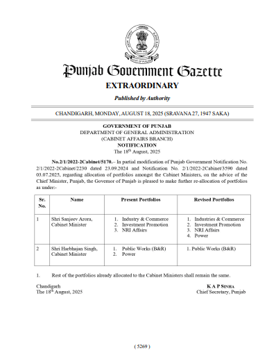 ਸੰਜੀਵ ਅਰੋੜਾ ਨੂੰ ਬਿਜਲੀ ਮੰਤਰੀ ਬਣਾਇਆ ਗਿਆ ਹੈ। ਪਹਿਲਾ ਇਹ ਅਹੁਦਾ ਹਰਭਜਨ ਸਿੰਘ ETO ਕੋਲ ਸੀ ਜਿਸ ਨੂੰ ਵਾਪਸ ਲੈ ਲਿਆ ਗਿਆ ਹੈ। ਇਸ ਤੋਂ ਪਹਿਲਾਂ, ਕੁਲਦੀਪ ਸਿੰਘ ਧਾਲੀਵਾਲ ਤੋਂ ਐਨਆਰਆਈ ਮਾਮਲਿਆਂ ਦਾ ਵਿਭਾਗ ਵਾਪਸ ਲੈ ਲਿਆ ਗਿਆ ਸੀ ਅਤੇ ਉਦਯੋਗ ਅਤੇ ਐਨਆਰਆਈ ਮਾਮਲਿਆਂ ਦਾ ਵਿਭਾਗ ਸੰਜੀਵ ਅਰੋੜਾ ਨੂੰ ਦਿੱਤਾ ਗਿਆ ਸੀ।