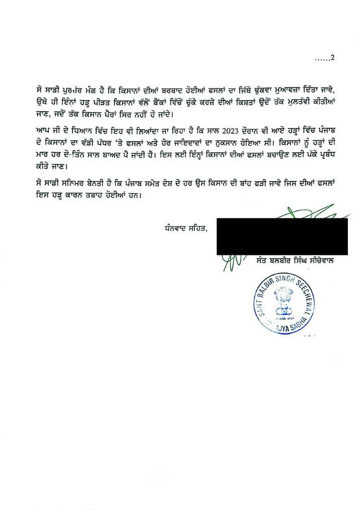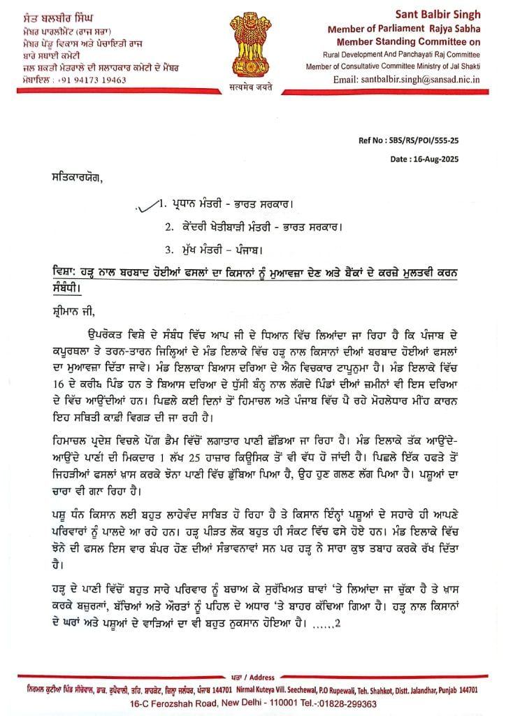 ਰਾਜ ਸਭਾ ਮੈਂਬਰ ਤੇ ਵਾਤਾਵਰਣ ਪ੍ਰੇਮੀ ਸੰਤ ਬਲਬੀਰ ਸਿੰਘ ਸੀਚੇਵਾਲ ਵੱਲੋਂ ਪ੍ਰਧਾਨ ਮੰਤਰੀ ਨਰਿੰਦਰ ਮੋਦੀ, ਕੇਂਦਰੀ ਖੇਤੀਬਾੜੀ ਮੰਤਰੀ ਸ਼ਿਵਰਾਜ ਚੌਹਾਨ ਤੇ ਪੰਜਾਬ ਦੇ ਮੁੱਖ ਮੰਤਰੀ ਭਗਵੰਤ ਸਿੰਘ ਮਾਨ ਨੂੰ ਪੱਤਰ ਲਿਖ ਕੇ ਹੜ੍ਹ ਪੀੜਤਾਂ ਨੂੰ ਮੁਆਵਜ਼ਾ ਦੇਣ ਦੀ ਮੰਗ ਕੀਤੀ ਗਈ ਹੈ। ਉਨ੍ਹਾਂ ਆਪਣੇ ਪੱਤਰ ‘ਚ ਲਿਖਿਆ ਹੈ ਕਿ ਮੰਡ ਇਲਾਕੇ ਦੇ ਕਿਸਾਨਾਂ ਨਾਲ ਹਰ ਦੂਜੇ ਜਾਂ ਫਿਰ ਤੀਜੇ ਸਾਲ ਅਜਿਹਾ ਭਾਣਾ ਵਾਪਰਦਾ ਹੈ, ਜਿਸ ਨਾਲ ਕਿਸਾਨਾਂ ਦੀ ਹਜ਼ਾਰਾਂ ਏਕੜ ਫਸਲਾਂ ਤਬਾਹ ਹੋ ਜਾਂਦੀਆਂ ਹਨ।