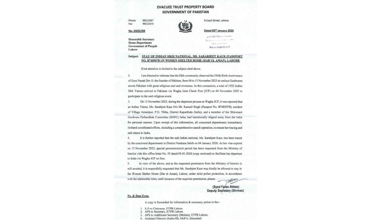 ਸਰਬਜੀਤ ਕੌਰ ਦੀ ਪਾਕਿਸਤਾਨ ਤੋਂ ਭਾਰਤ ਵਾਪਸੀ ਰੁਕੀ, ਵਿਸ਼ੇਸ਼ ਪਰਮਿਟ ਰੋਕਿਆ, ਲਾਹੌਰ ਦੇ ਦਾਰੁਲ ਅਮਾਨ ਵਿੱਚ ਕੀਤਾ ਸ਼ਿਫਟ
