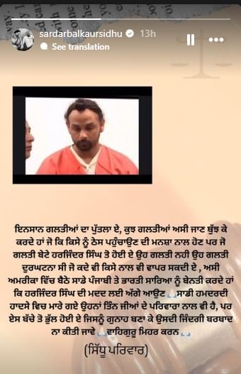 ਉਨ੍ਹਾਂ ਨੇ ਅੱਗੇ ਲਿਖਿਆ- ਅਸੀਂ ਅਮਰੀਕਾ ‘ਚ ਬੈਠੇ ਸਾਡੇ ਪੰਜਾਬੀ ਤੇ ਭਾਰਤੀ ਸਾਰਿਆ ਨੂੰ ਬੇਨਤੀ ਕਰਦੇ ਹਾਂ ਕਿ ਹਰਜਿੰਦਰ ਸਿੰਘ ਦੀ ਮਦਦ ਲਈ ਅੱਗੇ ਆਉਣ ਸਾਡੀ ਹਮਦਰਦੀ ਹਾਦਸੇ ‘ਚ ਮਾਰੇ ਗਏ ਉਨ੍ਹਾਂ ਤਿੰਨ ਜੀਆਂ ਦੇ ਪਰਿਵਾਰਾ ਨਾਲ ਵੀ ਹੈ, ਪਰ ਇਸ ਬੱਚੇ ਤੋ ਭੁੱਲ ਹੋਈ ਹੈ, ਜਿਸਨੂੰ ਗੁਨਾਹ ਬਣਾ ਕੇ ਉਸ ਦੀ ਜਿੰਦਗੀ ਬਰਬਾਦ ਨਾ ਕੀਤੀ ਜਾਵੇ। ਵਾਹਿਗੁਰੂ ਮਿਹਰ ਕਰਨ।