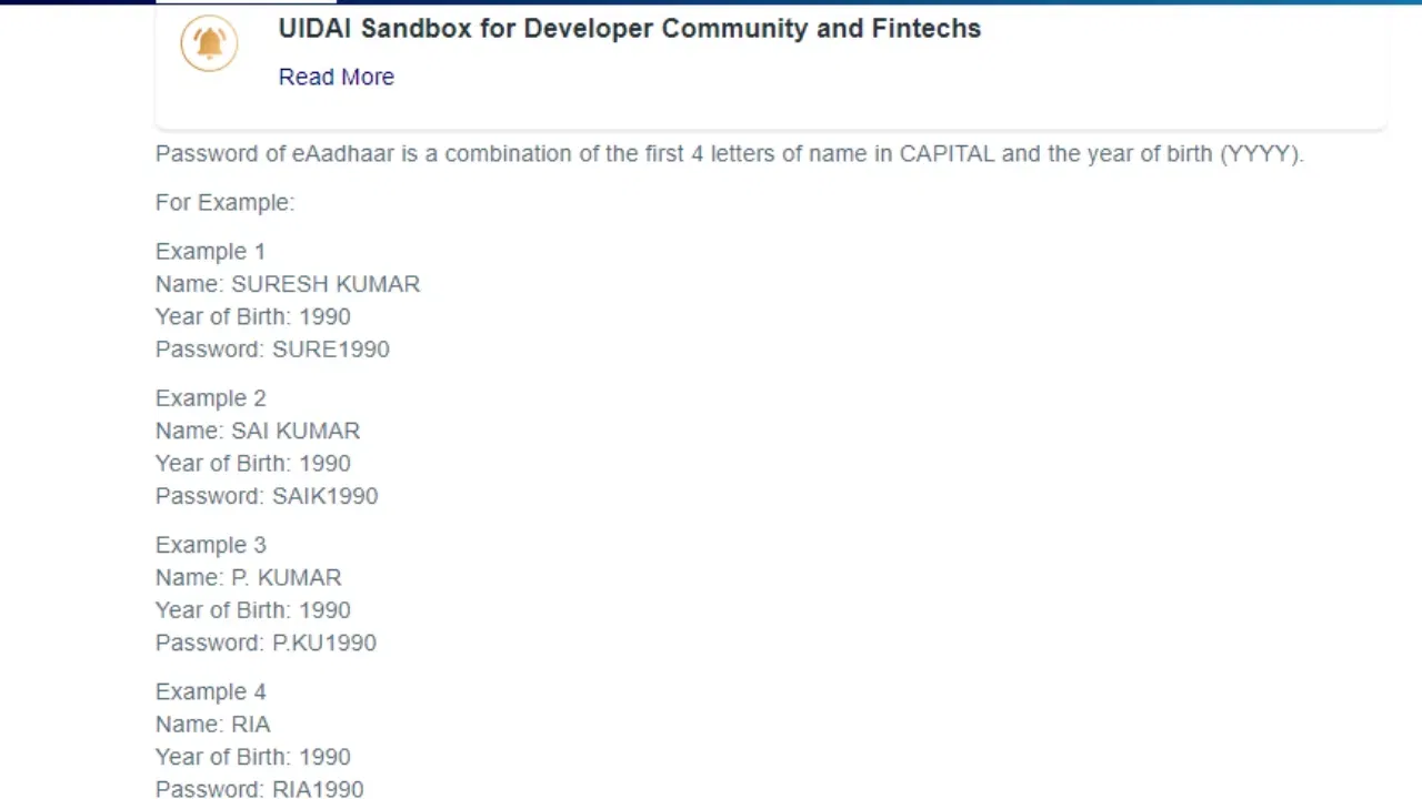UIDAI ਦੀ ਅਧਿਕਾਰਤ ਸਾਈਟ ‘ਤੇ ਲੋਕਾਂ ਦੀ ਸਹੂਲਤ ਲਈ ਈ-ਆਧਾਰ ਖੋਲ੍ਹਣ ਦਾ ਤਰੀਕਾ ਉਦਾਹਰਣ ਦੇ ਜ਼ਰੀਏ ਸਮਝਾਇਆ ਗਿਆ ਹੈ। PDF ਫਾਈਲ ਨੂੰ ਖੋਲ੍ਹਣ ਲਈ ਨਾਮ ਦੇ ਪਹਿਲੇ ਚਾਰ ਅੱਖਰਾਂ ਦੀ ਲੋੜ ਹੁੰਦੀ ਹੈ, ਜਨਮ ਦੇ ਸਾਲ ਦੇ ਨਾਲ-ਨਾਲ ਨਾਮ ਦੇ ਪਹਿਲੇ ਚਾਰ ਅੱਖਰਾਂ ਦੇ ਨਾਲ ਜਨਮ ਦਾ ਸਾਲ ਵੀ ਦਰਜ ਕਰਨਾ ਪੈਂਦਾ ਹੈ।