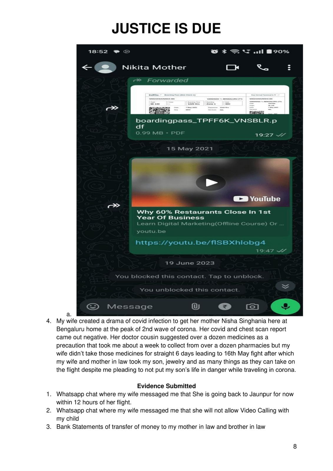 ਅਤੁਲ ਦੇ ਭਰਾ ਦੀ ਸ਼ਿਕਾਇਤ ‘ਤੇ ਬੇਂਗਲੁਰੂ ਪੁਲਿਸ ਨੇ ਪਤਨੀ ਨਿਕਿਤਾ, ਸੱਸ ਨਿਸ਼ਾ, ਸਾਲਾ ਅਨੁਰਾਗ ਅਤੇ ਚਾਚਾ-ਸਹੁਰਾ ਸੁਸ਼ੀਲ ਸਿੰਘਾਨੀਆ ਦੇ ਖਿਲਾਫ ਮਾਮਲਾ ਦਰਜ ਕੀਤਾ ਹੈ। ਖੁਦਕੁਸ਼ੀ ਤੋਂ ਪਹਿਲਾਂ ਅਤੁਲ ਨੇ ਇੱਕ ਵੀਡੀਓ ਅਤੇ 24 ਪੰਨਿਆਂ ਦੇ ਨੋਟ ਰਾਹੀਂ ਆਪਣੀ ਕਹਾਣੀ ਸੁਣਾਈ ਸੀ। ਉਨ੍ਹਾਂ ਇਹ ਵੀ ਕਿਹਾ ਕਿ ਜੇਕਰ ਮੈਨੂੰ ਇਨਸਾਫ਼ ਨਾ ਮਿਲਿਆ ਤਾਂ ਮੇਰੀਆਂ ਅਸਥੀਆਂ ਗਟਰ ਵਿੱਚ ਵਹਾ ਦੇਣਾ।