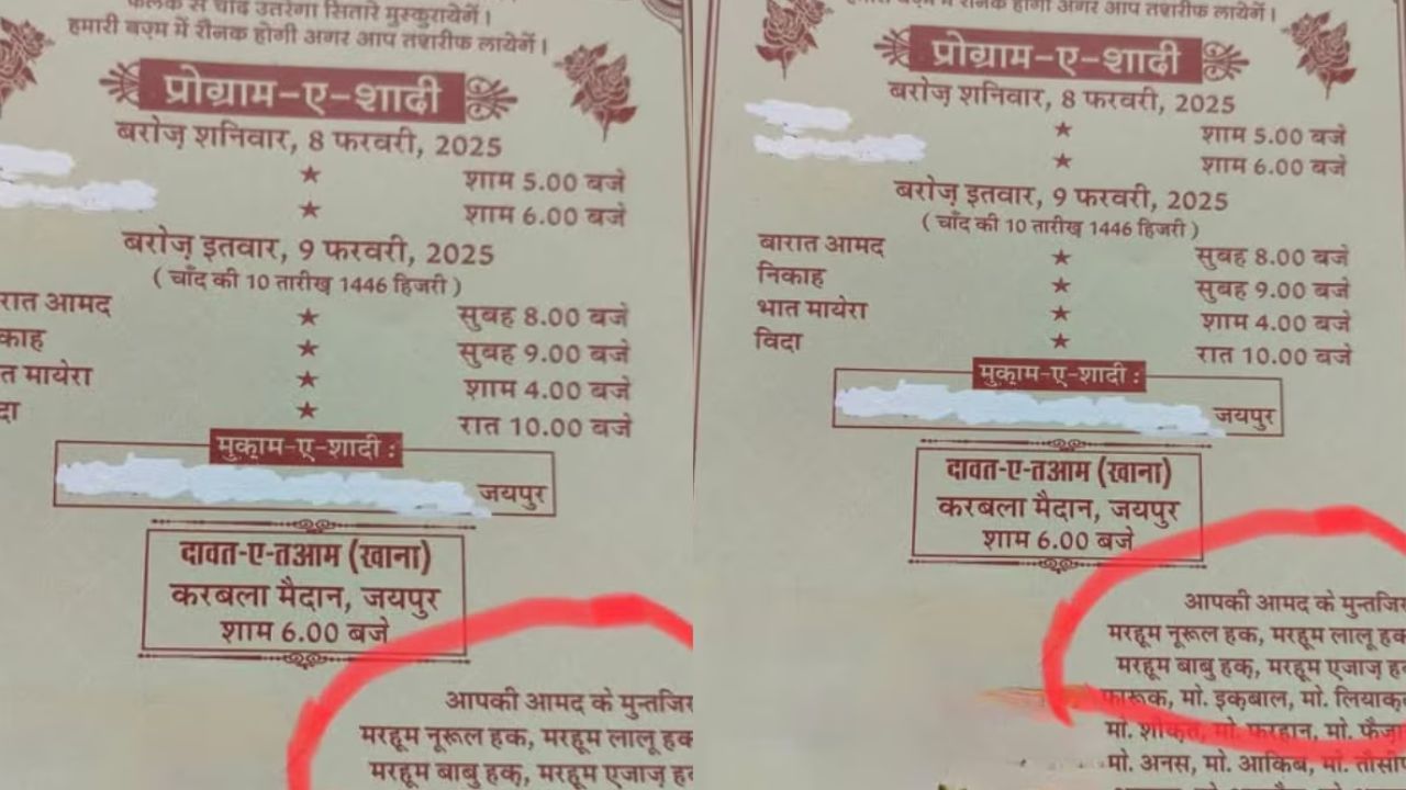 ਇਸ ਵਿਆਹ ਦੇ ਕਾਰਡ ਵਿੱਚ, ਆਉਣ ਵਾਲੇ ਦਰਸ਼ਕਾਂ ਦੇ ਨਾਵਾਂ ਦੀ ਬਜਾਏ ਮ੍ਰਿਤਕਾਂ ਦੇ ਨਾਮ ਲਿਖੇ ਗਏ ਹਨ। ਇਹ ਕਾਰਡ ਤੇ ਲਿਖਿਆ ਹੋਇਆ ਹੈ। ਮਰਹੂਮ ਨੂਰੂਲ ਹੱਕ, ਮਰਹੂਮ ਲਾਲੂ ਹੱਕ, ਮਰਹੂਮ ਬਾਬੂ ਹੱਕ, ਮਰਹੂਮ ਏਜਾਜ਼ ਹੱਕ, ਅਤੇ ਫਿਰ ਹੋਰਾਂ ਦੇ ਨਾਮ ਲਿਖੇ ਗਏ ਹਨ। ਇਹ ਵਿਆਹ ਜੈਪੁਰ ਦੇ ਕਰਬਲਾ ਮੈਦਾਨ ਵਿੱਚ ਹੈ। ਕਾਰਡ ਵਿੱਚ 8 ਫਰਵਰੀ ਅਤੇ 9 ਫਰਵਰੀ ਦੇ ਪ੍ਰੋਗਰਾਮ ਦਾ ਜ਼ਿਕਰ ਹੈ। ਇਹ ਕਾਰਡ ਵਾਇਰਲ ਹੋ ਰਿਹਾ ਹੈ। 600 ਤੋਂ ਵੱਧ ਲੋਕਾਂ ਨੇ ਇਸਨੂੰ ਪਸੰਦ ਕੀਤਾ ਹੈ। ਜਦੋਂ ਕਿ 100 ਤੋਂ ਵੱਧ ਲੋਕਾਂ ਨੇ ਟਿੱਪਣੀਆਂ ਕੀਤੀਆਂ ਹਨ। ਇੱਕ ਵਿਅਕਤੀ ਨੇ ਲਿਖਿਆ ਕਿ ਅਜਿਹੇ ਕਾਰਡ ਜੋਧਪੁਰ ਅਤੇ ਜੈਪੁਰ ਦੇ ਲੋਕਾਂ ਵਿੱਚ ਆਮ ਹਨ।