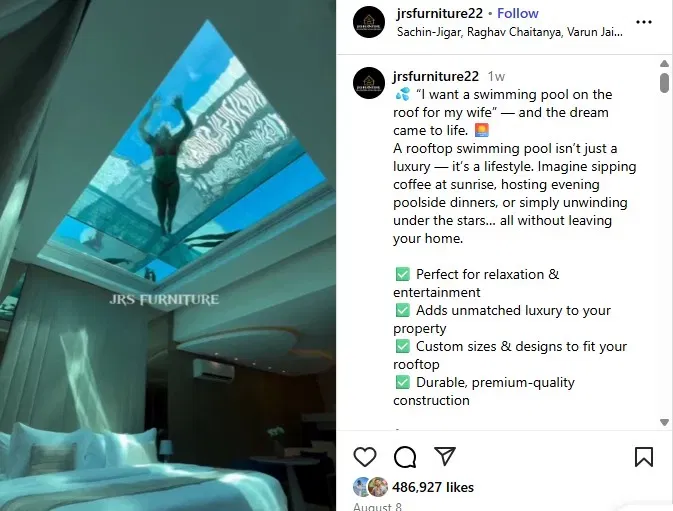 @jrsfurniture22 ਇੰਸਟਾਗ੍ਰਾਮ ਹੈਂਡਲ ਤੋਂ ਸ਼ੇਅਰ ਕੀਤੀ ਗਈ ਇਸ ਵੀਡੀਓ ਨੂੰ ਹੁਣ ਤੱਕ ਲਗਭਗ 5 ਲੱਖ ਲੋਕਾਂ ਨੇ ਪਸੰਦ ਕੀਤਾ ਹੈ। ਹਾਲਾਂਕਿ, ਪੋਸਟ ਨੂੰ ਨੇਟੀਜ਼ਨਸ ਤੋਂ ਮਿਲੀ-ਜੁਲੀ ਪ੍ਰਤੀਕਿਰਿਆ ਮਿਲੀ ਹੈ। ਕੁਝ ਪੂਲ ਦੇ ਡਿਜ਼ਾਈਨ ਨੂੰ ਦੇਖ ਕੇ ਹੈਰਾਨ ਰਹਿ ਗਏ, ਜਦੋਂ ਕਿ ਕਈ ਨੇਟੀਜ਼ਨਸ ਨੇ ਇਸਦਾ ਮਜ਼ਾਕ ਵੀ ਉਡਾਇਆ ਹੈ।