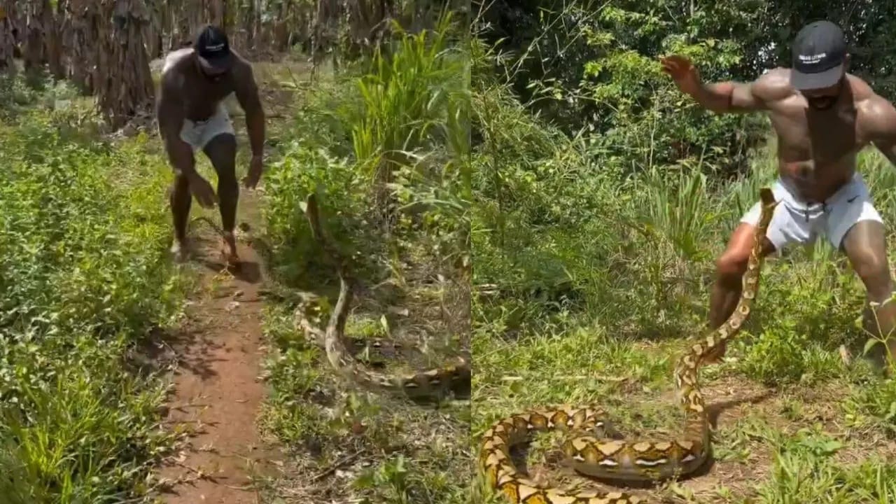 ਵੀਡੀਓ ਵਿੱਚ, ਤੁਸੀਂ ਆਦਮੀ ਨੂੰ ਅਜਗਰ ਦੀ ਪੂਛ ਫੜ ਕੇ ਝਾੜੀਆਂ ਵਿੱਚੋਂ ਬਾਹਰ ਕੱਢਦੇ ਹੋਏ ਦੇਖ ਸਕਦੇ ਹੋ। ਜਿਵੇਂ ਹੀ ਉਸਨੇ ਇਸਨੂੰ ਬਾਹਰ ਕੱਢਿਆ, ਉਸਨੇ ਸ਼ਖਸ ‘ਤੇ ਹਮਲਾ ਕਰ ਦਿੱਤਾ। ਹਾਲਾਂਕਿ, ਉਹ ਪਹਿਲਾਂ ਹੀ ਸੁਚੇਤ ਸੀ, ਇਸ ਲਈ ਸੱਪ ਦੇ ਹਮਲਾ ਹੁੰਦੇ ਹੀ ਉਹ ਪਿੱਛੇ ਹਟ ਗਿਆ। ਇਸ ਤੋਂ ਬਾਅਦ ਅਜਗਰ ਨੇ ਕਈ ਵਾਰ ਉਸ ‘ਤੇ ਹਮਲਾ ਕਰਨ ਦੀ ਕੋਸ਼ਿਸ਼ ਕੀਤੀ, ਪਰ ਉਹ ਹਰ ਵਾਰ ਬਚ ਗਿਆ। ਅੰਤ ਵਿੱਚ, ਉਸਨੇ ਆਪਣੇ ਤਜਰਬੇ ਦਾ ਫਾਇਦਾ ਉਠਾਉਂਦਿਆਂ ਅਜਗਰ ਨੂੰ ਫੜ ਲਿਆ, ਤਾਂ ਜੋ ਉਹ ਉਸ ਉੱਤੇ ਹਮਲਾ ਨਾ ਕਰ ਸਕੇ। ਅਜਿਹੀ ਹਿੰਮਤ ਲੋਕਾਂ ਵਿੱਚ ਘੱਟ ਹੀ ਦੇਖਣ ਨੂੰ ਮਿਲਦੀ ਹੈ।