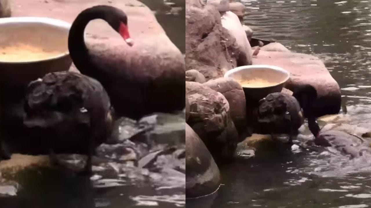 ਹਾਲ ਹੀ ਵਿੱਚ, ਇੱਕ ਹੰਸ ਦਾ ਵਿਲੱਖਣ ਅਤੇ ਭਾਵਨਾਤਮਕ ਵਿਵਹਾਰ ਪ੍ਰਦਰਸ਼ਿਤ ਕਰਨ ਵਾਲਾ ਵੀਡੀਓ ਵਾਇਰਲ ਹੋਇਆ ਹੈ। ਇਹ ਵੀਡੀਓ ਨਾ ਸਿਰਫ਼ ਦੇਖਣ ਵਿੱਚ ਸੁੰਦਰ ਹੈ ਬਲਕਿ ਇੱਕ ਡੂੰਘਾ ਸੰਦੇਸ਼ ਵੀ ਦਿੰਦਾ ਹੈ। ਵੀਡੀਓ ਵਿੱਚ ਇੱਕ ਕਾਲਾ ਹੰਸ ਇੱਕ ਸ਼ਾਂਤ ਤਲਾਬ ਦੇ ਕਿਨਾਰੇ ਖੜ੍ਹਾ ਹੈ, ਜਿਸਦੇ ਸਾਹਮਣੇ ਪਾਣੀ ਵਿੱਚ ਕਈ ਮੱਛੀਆਂ ਤੈਰ ਰਹੀਆਂ ਹਨ। ਅਸੀਂ ਆਮ ਤੌਰ ‘ਤੇ ਹੰਸ ਨੂੰ ਆਪਣੇ ਆਪ ਖਾਣਾ ਖਾਂਦੇ ਦੇਖਦੇ ਹਾਂ, ਪਰ ਇੱਥੇ ਦਾ ਦ੍ਰਿਸ਼ ਕਾਫ਼ੀ ਵਿਲੱਖਣ ਅਤੇ ਖਾਸ ਹੈ।