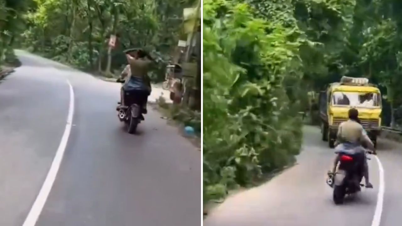 ਸੋਸ਼ਲ ਮੀਡੀਆ ‘ਤੇ ਵਾਇਰਲ ਹੋ ਰਹੀ ਵੀਡੀਓ ‘ਚ ਦੇਖਿਆ ਜਾ ਰਿਹਾ ਹੈ ਕਿ ਇਕ ਵਿਅਕਤੀ ਇੱਕ ਟੂ ਵੇਅ ਸੜਕ ‘ਤੇ ਬਾਈਕ ਚਲਾ ਰਿਹਾ ਹੈ। ਅੱਗੇ ਸੜਕ ‘ਤੇ ਬਲਾਈਂਡ ਮੋੜ ਹੈ ਤੇ ਦੇਖਦੇ ਹੀ ਦੇਖਦੇ ਉਹ ਬਾਈਕ ਨੂੰ ਲਹਿਰਾ ਕੇ ਚਲਾਉਣ ਲੱਗਦਾ ਹੈ। ਉਸਦੇ ਪਿੱਛੇ ਉਸਦਾ ਇੱਕ ਦੋਸਤ ਵੀ ਬੈਠਾ ਹੈ। ਅਚਾਨਕ ਸਾਹਮਣੇ ਤੋਂ ਇੱਕ ਡੰਪਰ ਆਉਂਦਾ ਹੈ ਅਤੇ ਉਹ ਦੋਵੇਂ ਆਪਣੀ ਬਾਈਕ ‘ਤੇ ਇਸ ਦੇ ਬਿਲਕੁਲ ਸਾਹਮਣੇ ਆ ਜਾਂਦੇ ਹਨ। ਖੁਸ਼ਕਿਸਮਤੀ ਨਾਲ ਉਨ੍ਹਾਂ ਨੂੰ ਸਮਾਂ ਮਿਲ ਗਿਆ ਅਤੇ ਉਹ ਵਿਅਕਤੀ ਆਪਣੀ ਬਾਈਕ ਨੂੰ ਖਾਲੀ ਜਗ੍ਹਾ ਵੱਲ ਘੁੰਮਾ ਲੈਂਦਾ ਹੈ। ਇਸ ਤਰ੍ਹਾਂ ਉਨ੍ਹਾਂ ਦੀ ਜਾਨ ਬਚ ਜਾਂਦੀ ਹੈ। ਟੱਕਰ ਤੋਂ ਬਚਣ ਤੋਂ ਬਾਅਦ ਦੋਵਾਂ ਦੀ ਪ੍ਰਤੀਕਿਰਿਆ ਦੇਖ ਕੇ ਤੁਸੀਂ ਸਮਝ ਜਾਵੋਗੇ ਕਿ ਉਹ ਇਕ ਪਲ ਲਈ ਕਿੰਨਾ ਡਰਾਉਣਾ ਰਿਹਾ ਹੋਵੇਗਾ।