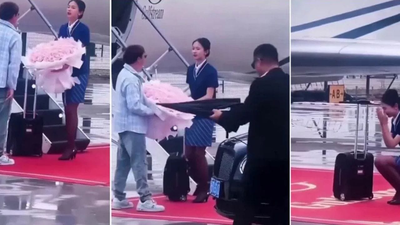 Proposal Viral Video : ਚੀਨ (China) ਤੋਂ ਵਾਇਰਲ ਹੋਈ ਇੱਕ ਵੀਡੀਓ ਸੋਸ਼ਲ ਮੀਡੀਆ ਦੀ ਦੁਨੀਆ ਵਿੱਚ ਤੂਫਾਨ ਮਚਾ ਰਹੀ ਹੈ। ਇਸ ਵੀਡੀਓ ਵਿੱਚ, ਇੱਕ ਆਮ ਜਿਹੇ ਦਿੱਖਣ ਵਾਲੇ ਆਦਮੀ ਨੇ ਕਥਿਤ ਤੌਰ ‘ਤੇ ਇੱਕ ਹੰਕਾਰੀ ਏਅਰ ਹੋਸਟੇਸ (Air Hostess) ਨੂੰ ਸਬਕ ਸਿਖਾਇਆ, ਜਿਸ ਕਾਰਨ ਉਹ ਰਨਵੇਅ ‘ਤੇ ਫੁੱਟ-ਫੁੱਟ ਕੇ ਰੋਣ ਲੱਗ ਪਈ। ਇਸਨੂੰ ਦੇਖਣ ਤੋਂ ਬਾਅਦ, ਨੇਟੀਜ਼ਨ ਇਸਨੂੰ “ਇੰਸਟੈट ਕਰਮਾ” ਕਹਿ ਰਹੇ ਹਨ।