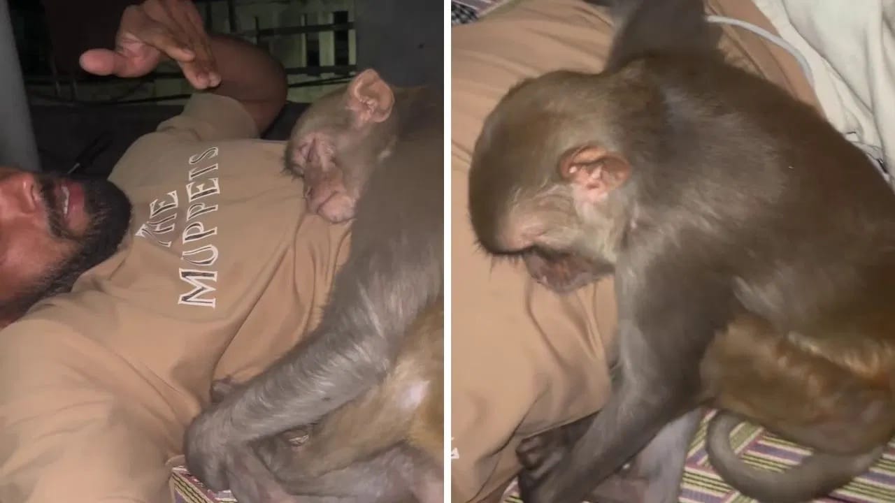ਇੱਕ ਨੌਜਵਾਨ ਰਾਤ ਨੂੰ ਆਪਣੀ ਛੱਤ ‘ਤੇ ਸ਼ਾਂਤੀ ਨਾਲ ਸੌਣ ਗਿਆ ਸੀ, ਪਰ ਜਦੋਂ ਉਹ ਜਾਗਿਆ, ਤਾਂ ਉਸ ਦੀਆਂ ਹੈਰਾਨੀ ਨਾਲ ਫੱਟੀਆਂ ਦੀਆਂ ਫੱਟੀਆਂ ਰਹਿ ਗਈਆਂ। ਵਾਇਰਲ ਵੀਡੀਓ ਵਿੱਚ ਇੱਕ ਨੌਜਵਾਨ ਨੂੰ ਫੋਲਡਿੰਗ ਬੈੱਡ’ਤੇ ਲੇਟਿਆ ਹੋਇਆ ਦੇਖਿਆ ਜਾ ਸਕਦਾ ਹੈ, ਉਸਦੇ ਨਾਲ ਹੀ ਇੱਕ ਬਾਂਦਰ ਇੱਕ ਛੋਟੇ ਬੱਚੇ ਵਾਂਗ ਉਸਦੀ ਛਾਤੀ ਨਾਲ ਲਿਪਟ ਕੇ ਡੂੰਘੀ ਨੀਂਦ ਵਿੱਚ ਸੁੱਤਾ ਪਿਆ ਹੈ।