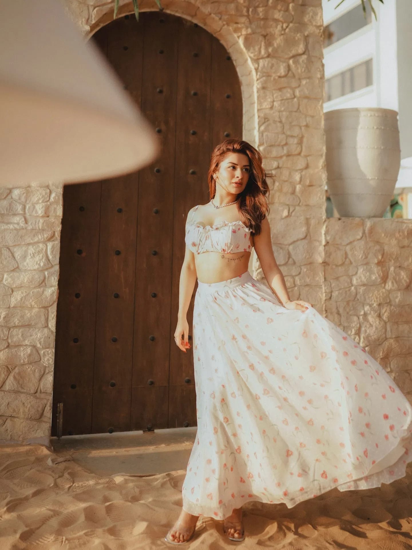 ਗਰਮੀ ਦੇ ਫੰਕਸ਼ਨ ਵਿੱਚ ਜੇਕਰ ਰਿੱਚ ਲੁੱਕ ਚਾਹੀਦੀ ਹੈ ਪਰ ਆਊਟਫਿਟ ਲਾਈਟ ਵੇਟ ਹੋਵੇ, ਤਾਂ ਤੁਸੀਂ ਸੰਦੀਪਾ ਧਰ ਵਾਂਗ ਵੈਲਵੇਟ ਦੇ ਇੰਬੈਲਿਸ਼ਡ ਕੱਟ ਸਲੀਵ ਬਲਾਊਜ਼ ਦੇ ਨਾਲ ਲਾਈਟ ਵੇਟ ਪ੍ਰਿੰਟਿਡ ਲਹਿੰਗਾ ਕੈਰੀ ਕਰੋ।